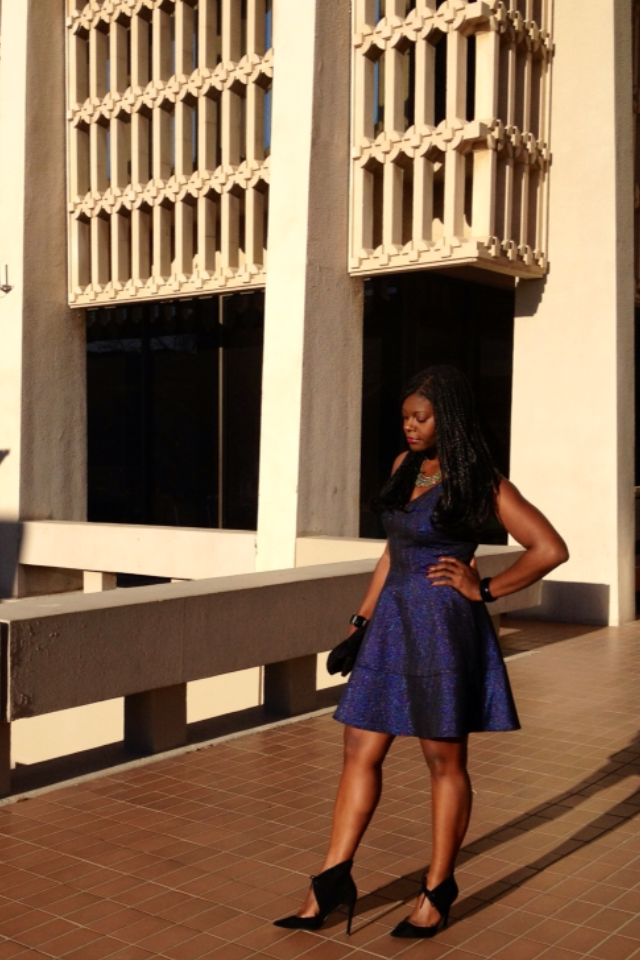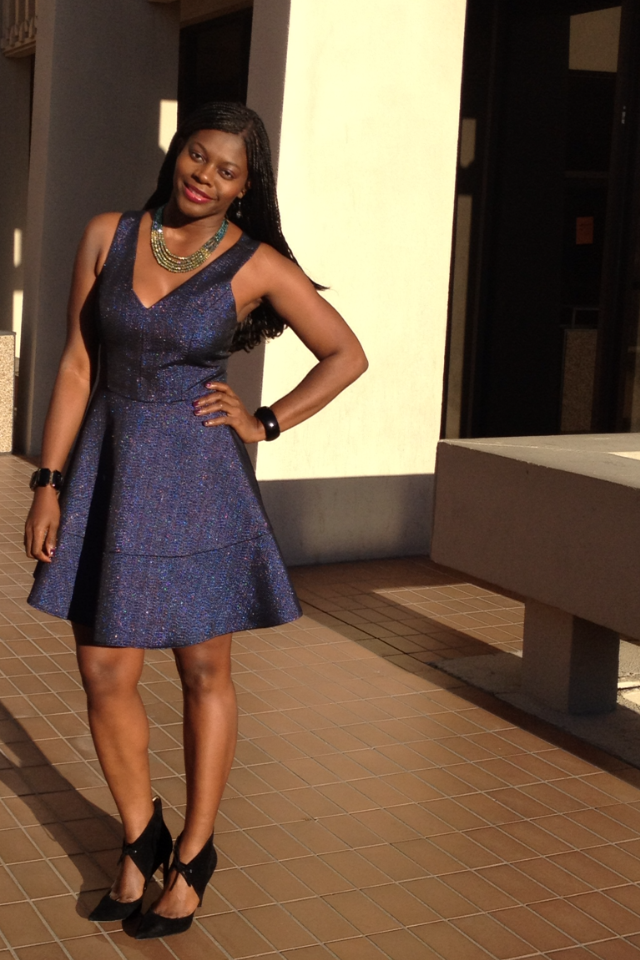 What are your New Year eve (NYE) plans? Although I live in Texas, I’ll be in Austin, another Texas city. I chose to pack this fit & flare dress as a NYE option because it’s a nice mix of not casual yet not too dressy because being in another city and not knowing the exact plans, I thought it’d work with various plans. I thought the shimmer in it was a nice touch for NYE. I added the colored necklace to enhance the blue, a black clutch and black shoes to complete the feminine look. By the way, fit and flare dresses are flattering and great for hiding hips when needed yet accentuating the waist.