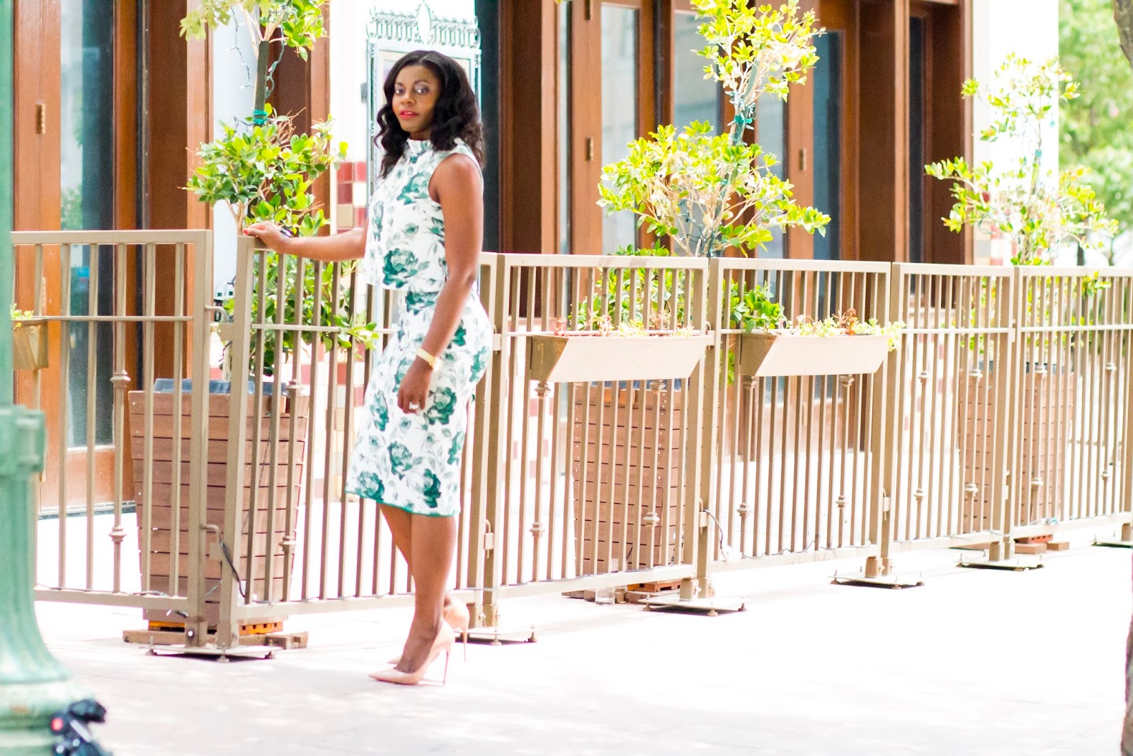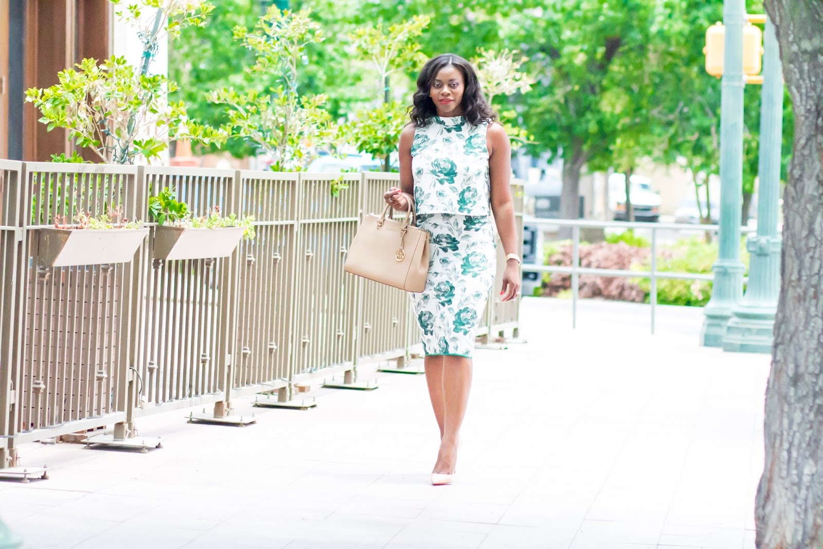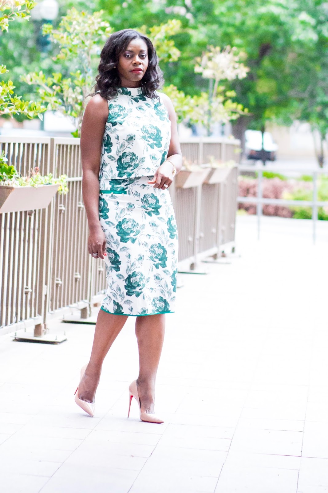 Anyway this is another look taken months back and sharing now because it’s still warm here in Texas but in cooler areas, a camel coat can be thrown over this look especially since the top is a high neck which I loved. This is a 2-piece look with pieces which can be worn with other tops, skirts, shorts or trousers which goes a long way—an advantage of 2-piece outfits. I paired this with nude heels and bag keeping the focus on the green florals. Hope you like and thanks for stopping by!