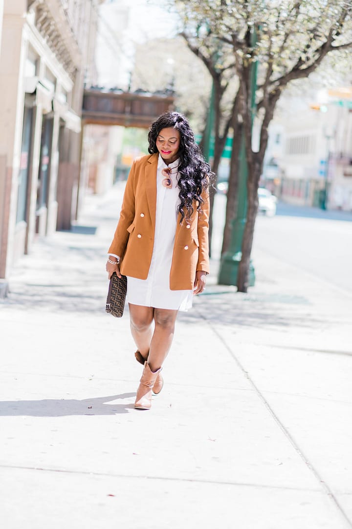Details: Booties -Amazon (Similar, Similar), Shirt dress- Asos (Here), Blazer -H&M (Similar, Similar), Bag- Vintage Fendi (Similar, Similar), Sunnies- Gifted (Similar, Similar), Photos by Angie Photo .