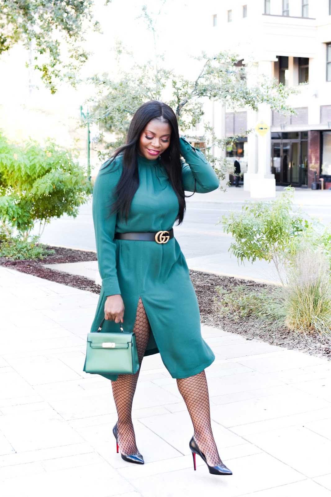 About my look being that it’s my birthday, I wanted a dressy look and so I added fishnet tights, a belt, and lady-like bag to this green dress I’d found on sale months ago. Hope you like it!
