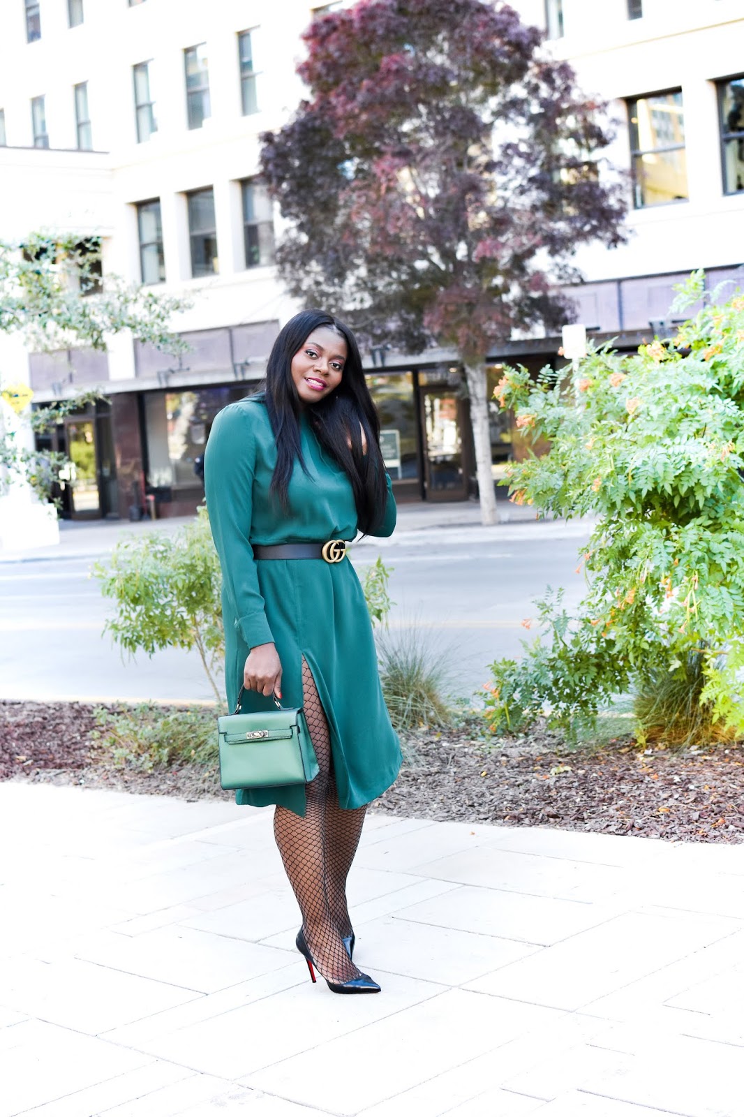 About my look being that it’s my birthday, I wanted a dressy look and so I added fishnet tights, a belt, and lady-like bag to this green dress I’d found on sale months ago. Hope you like it!