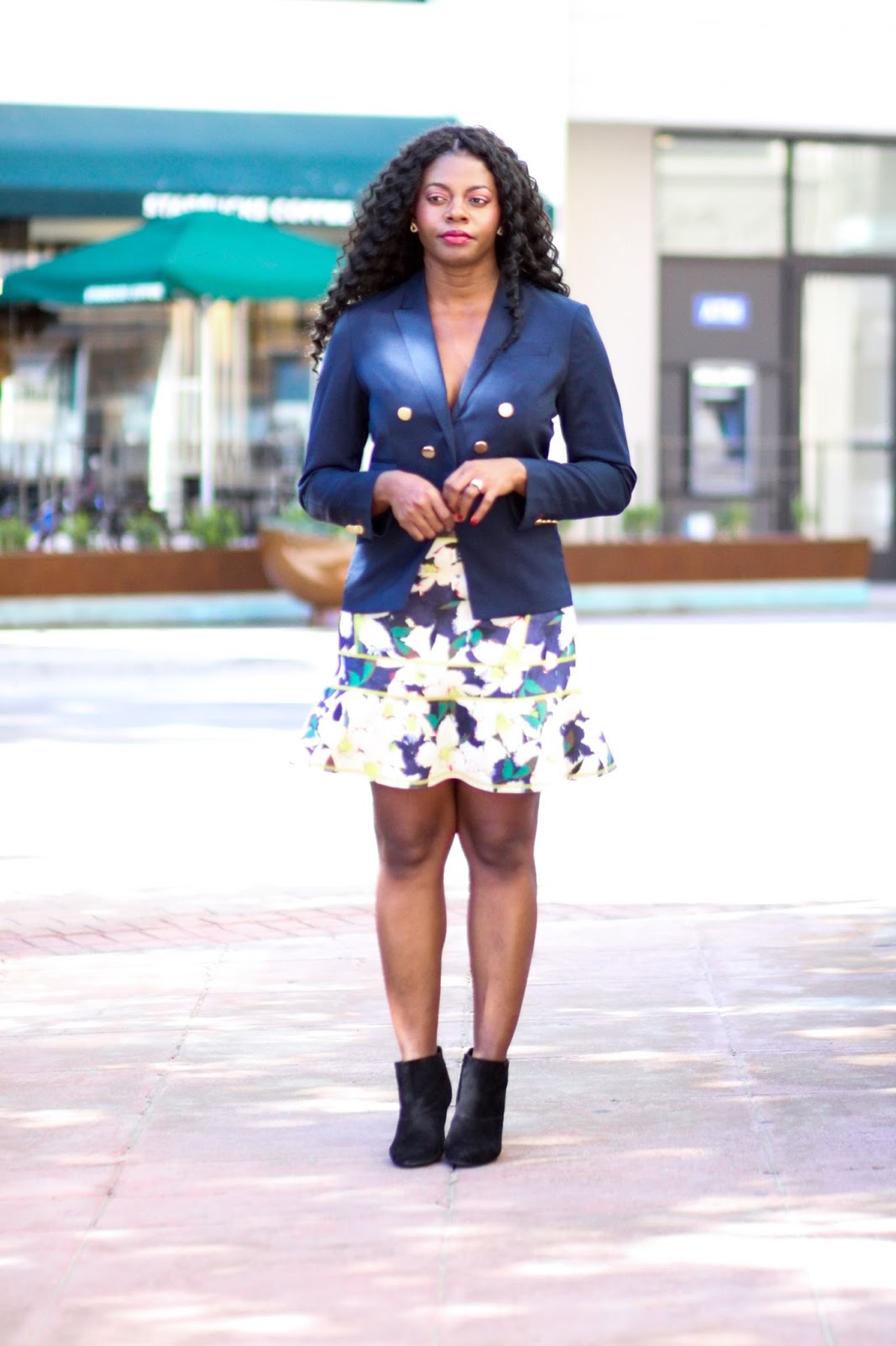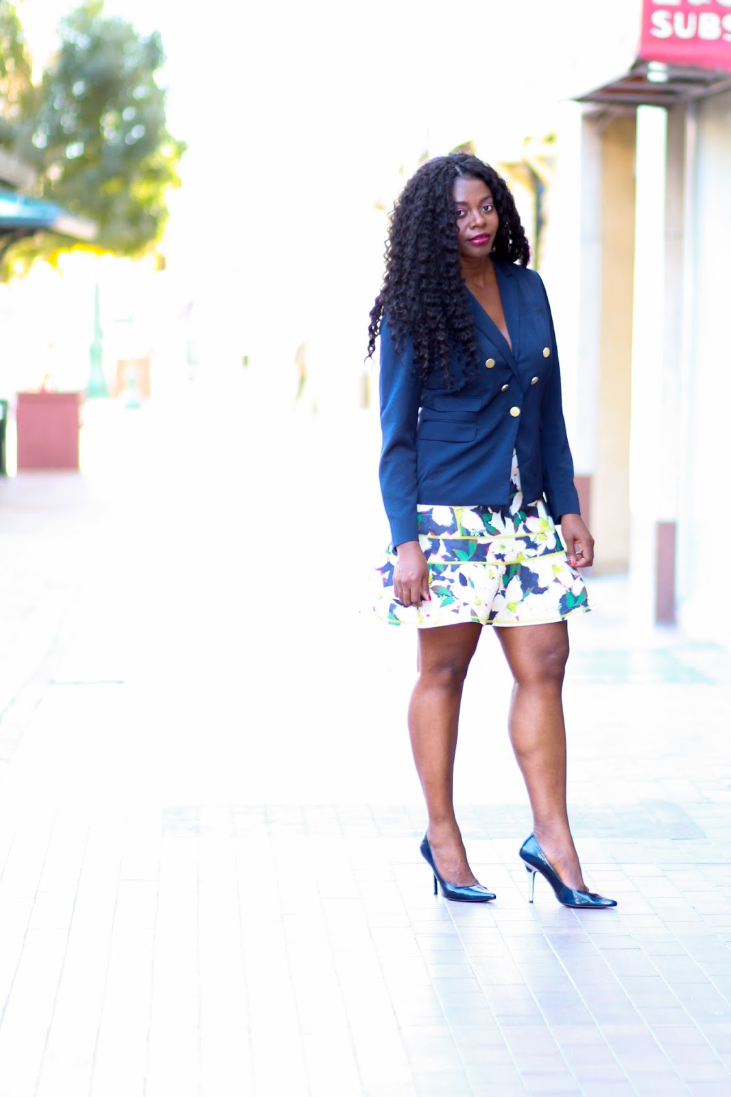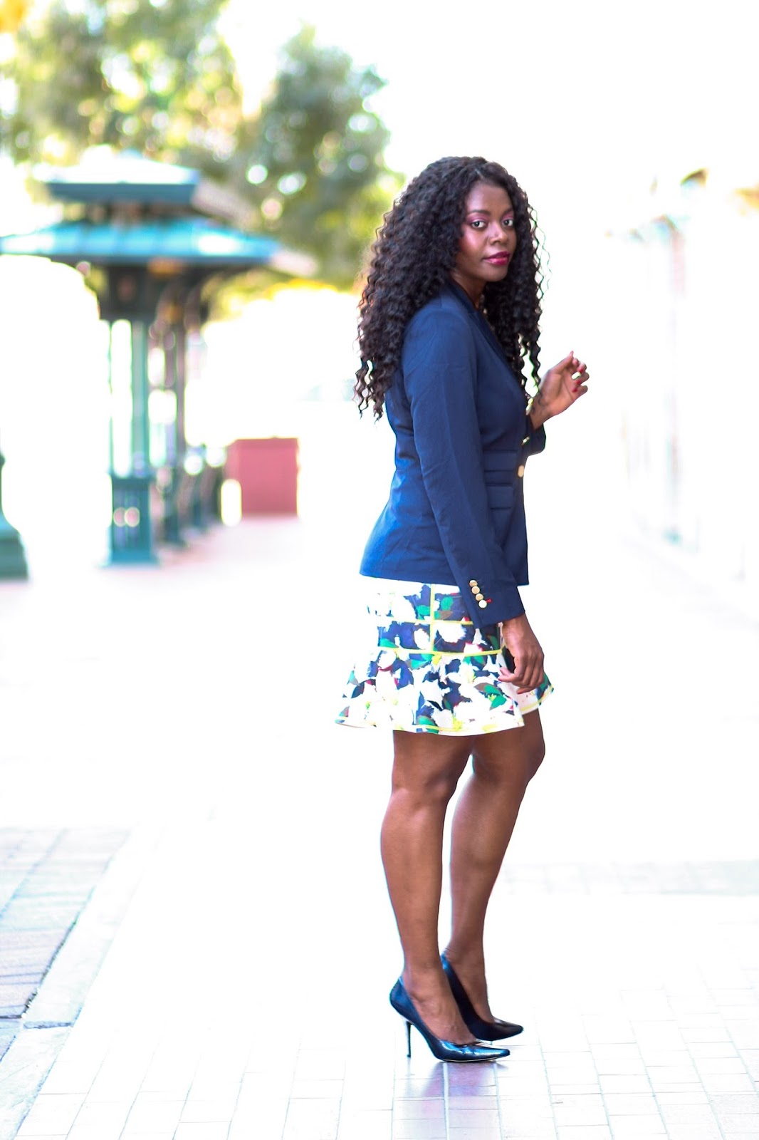 About this look, I pulled several older pieces in my closet and restyled.  I’d wanted to pair the skirt with boots but another pair but could not find it at the location so I improvised with these and although I initially was not fond of it, I like that it’s a different unexpected twist to the look.  On the other hand, I also paired the look with navy heels to match the blazer worn as a top.  This pairing I thought was more expected.  Which do you like? Thanks for stopping by!