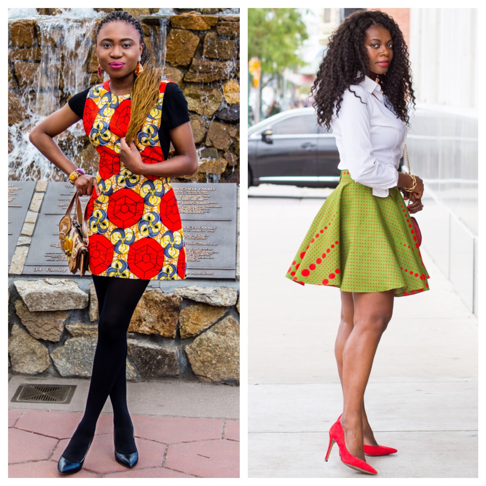 For our collaboration, we styled Ankara (African inspired fabric) pieces.  I love how Louisa layered that pinafore dress in all black keeping the focus on the dress, and the dress it’s self is so cute!  Her blog gives you great information on different topics like starting a blog, monetizing from your blog etc as well as styling some beautiful affordable pieces.  You can also find her here on Instagram, and facebook.  I on the other hand chose to bring out the red from the skirt, afterall ankara pieces are known to be vibrant and I did that by adding a red bag and heels, paired with a classic button up neutral white shirt.