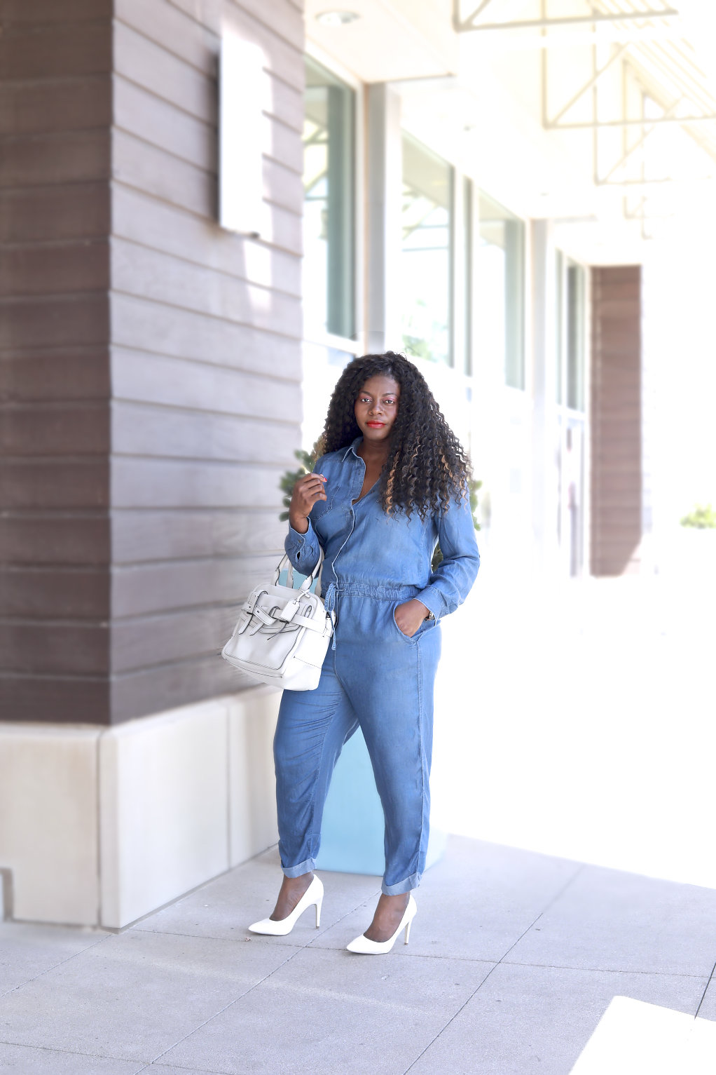 Anyway about this look, when you think of somethings you’ll be wearing in the spring and even summer, I think some of you will say some sort of denim year round and whites. White heels area bit trendy and scary for some to pull off but I think they are not to be feared as long as it’s worn in a classy way and I think pairing it with denim is one way.  Also, denim can be worn year round and for warmer months, a light chambray-denim look like this works because it’s a light material and a relaxed fit.  I simply added a white bag to complement the whole look.  Hope you like!