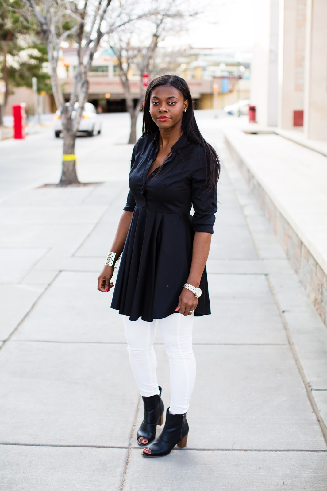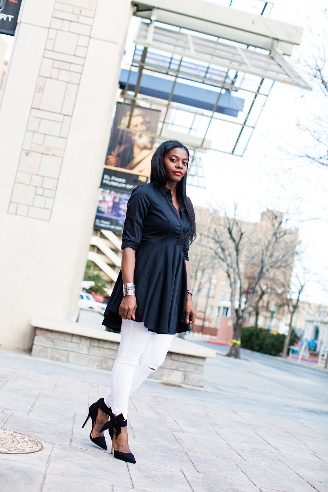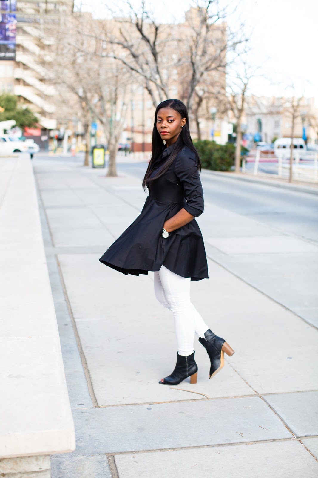 With this look I paired one of my favorite shirt dresses over jeans for a different take on shirt dresses but kept the look simple in black and white yet wearing different fun shoes. Thanks for stopping by!