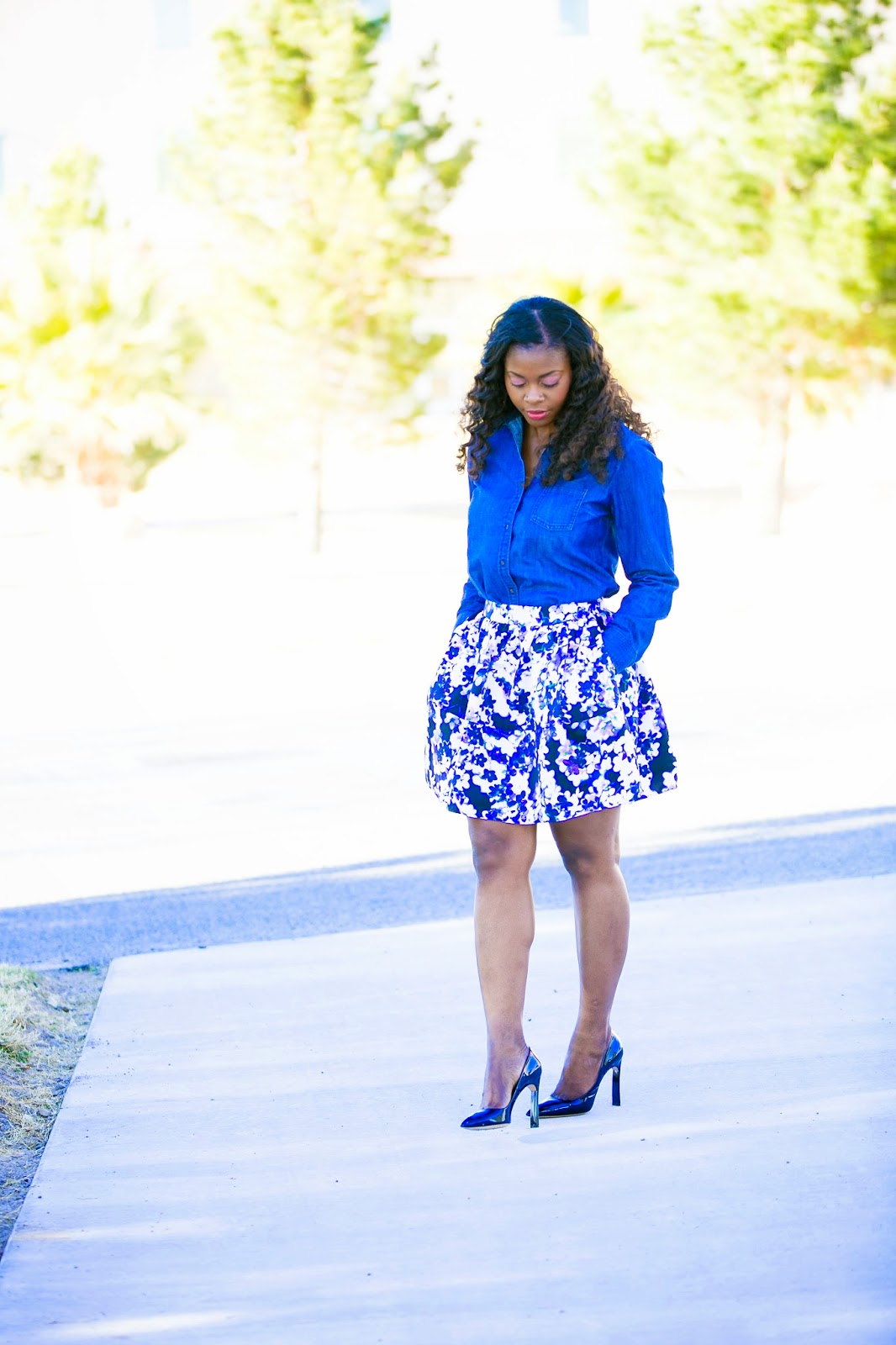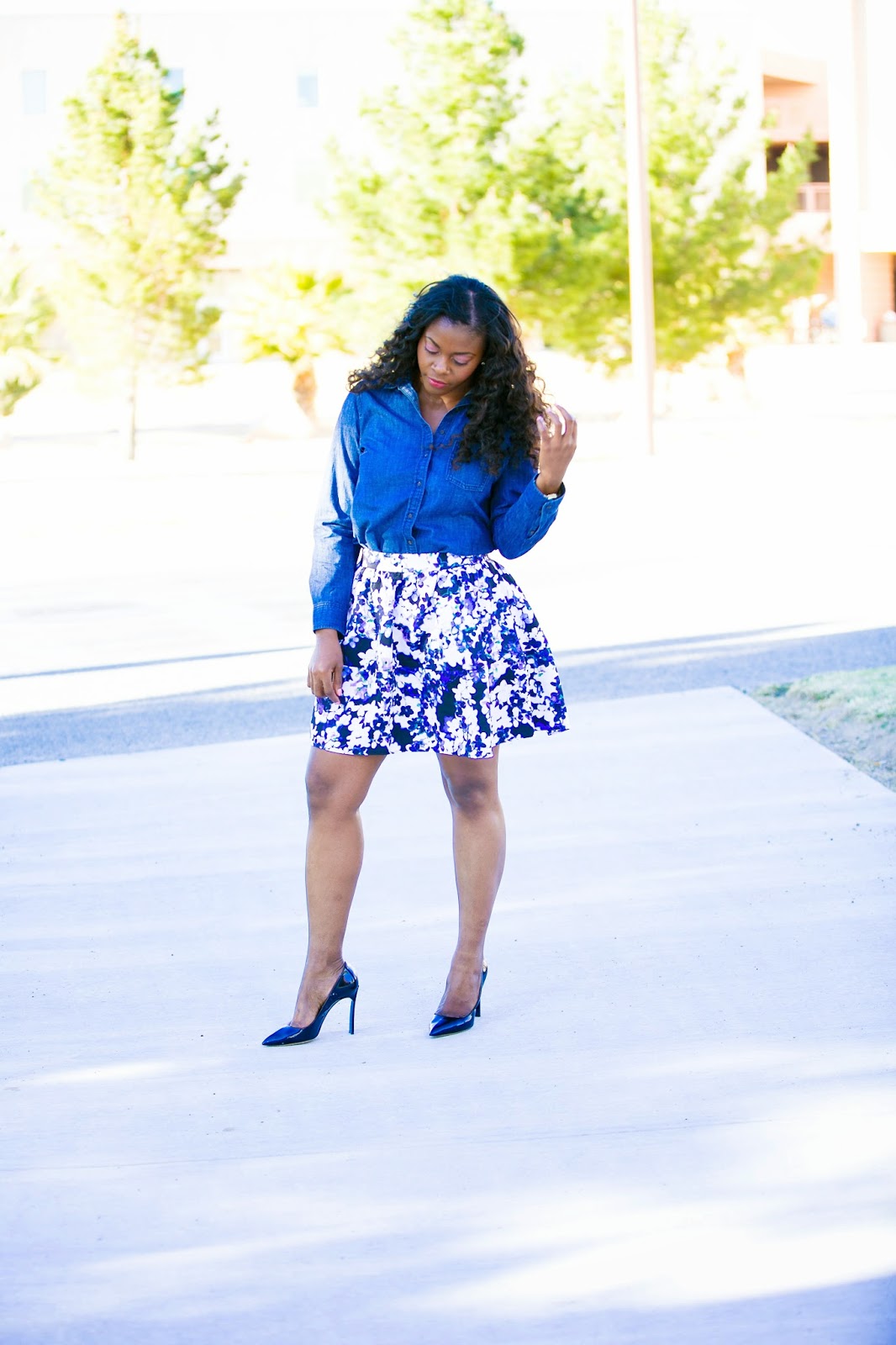 With Easter season and spring, comes florals. I wanted to pair this floral skirt with a blue top and thought the denim shirt was a good fit which could dress down the look if paired with flats/sandals, or dress it up with heels as I did. have a good week and thanks for reading!