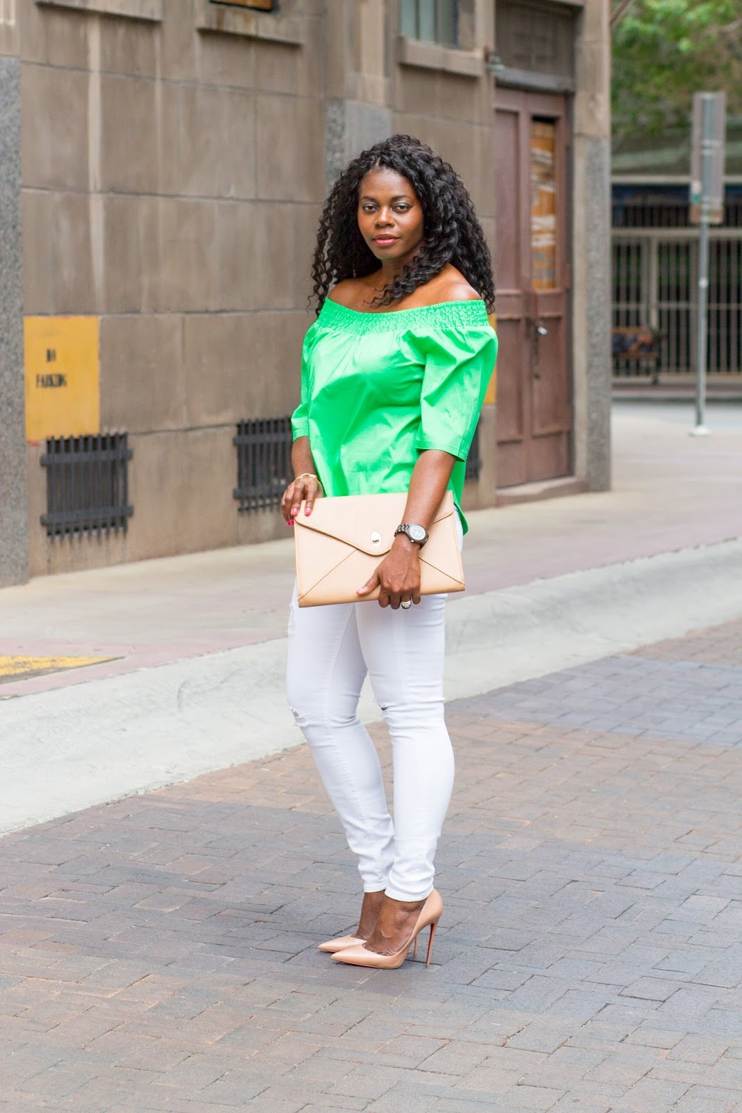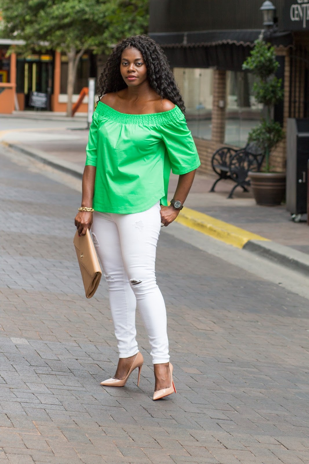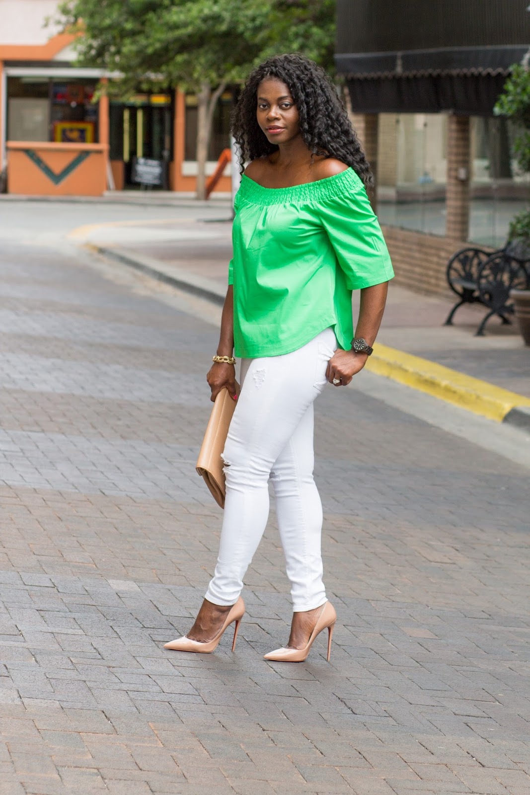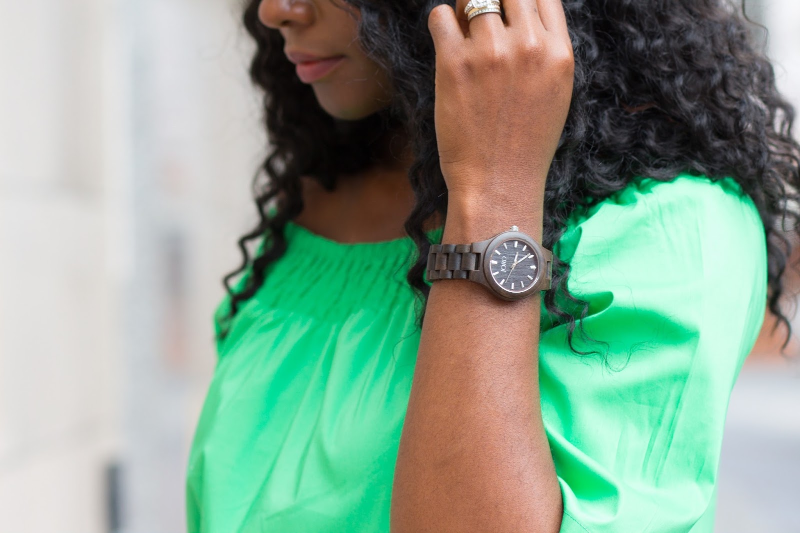 About this look, I wanted to add a pop of color to this white jeans, nude heels, and dark brown jord wood watch combo and did so with a summer trend, this green off the shoulder top. I was gifted this watch and have to say I love that it’s lightweight yet durable. I picked this color because I needed a brown colored watch in my collection but there are so many other pretty color options. If in need of a new watch or a gift idea, consider a jord time piece.
