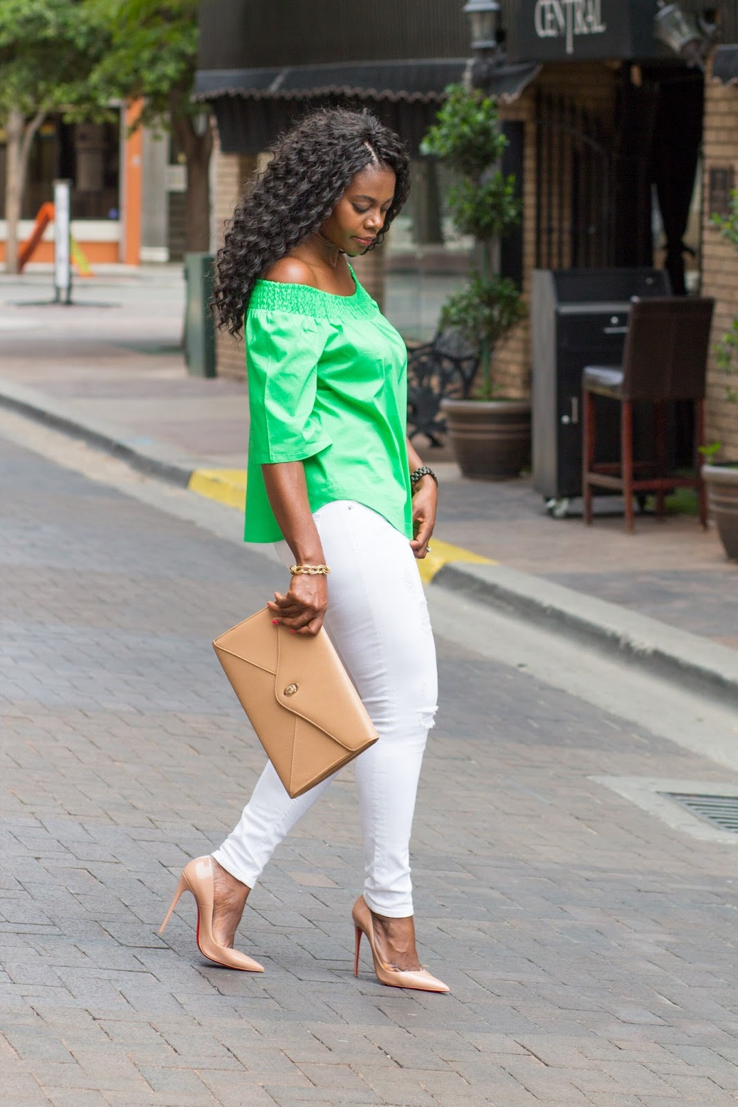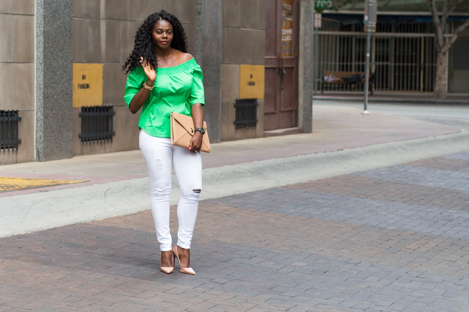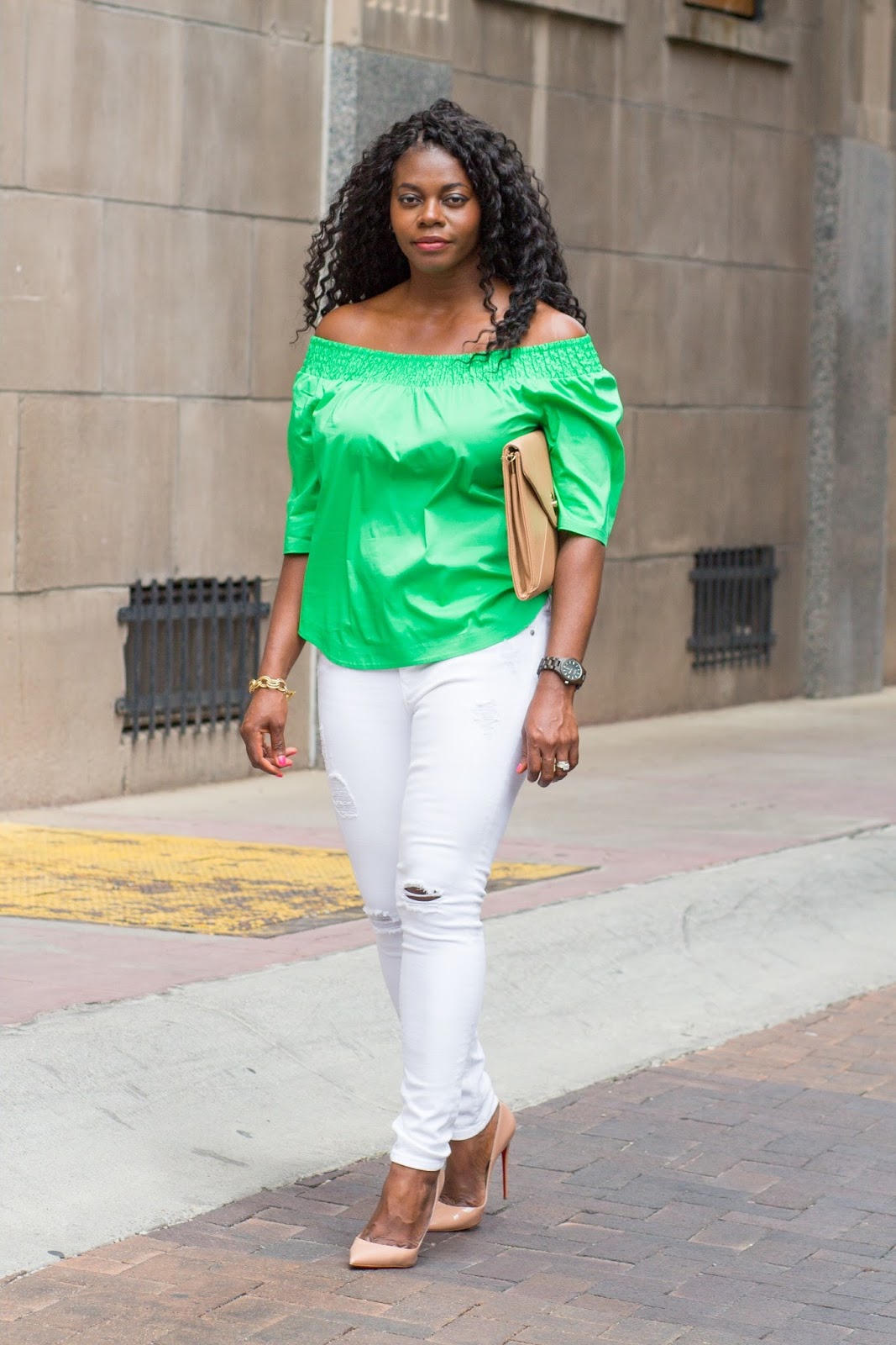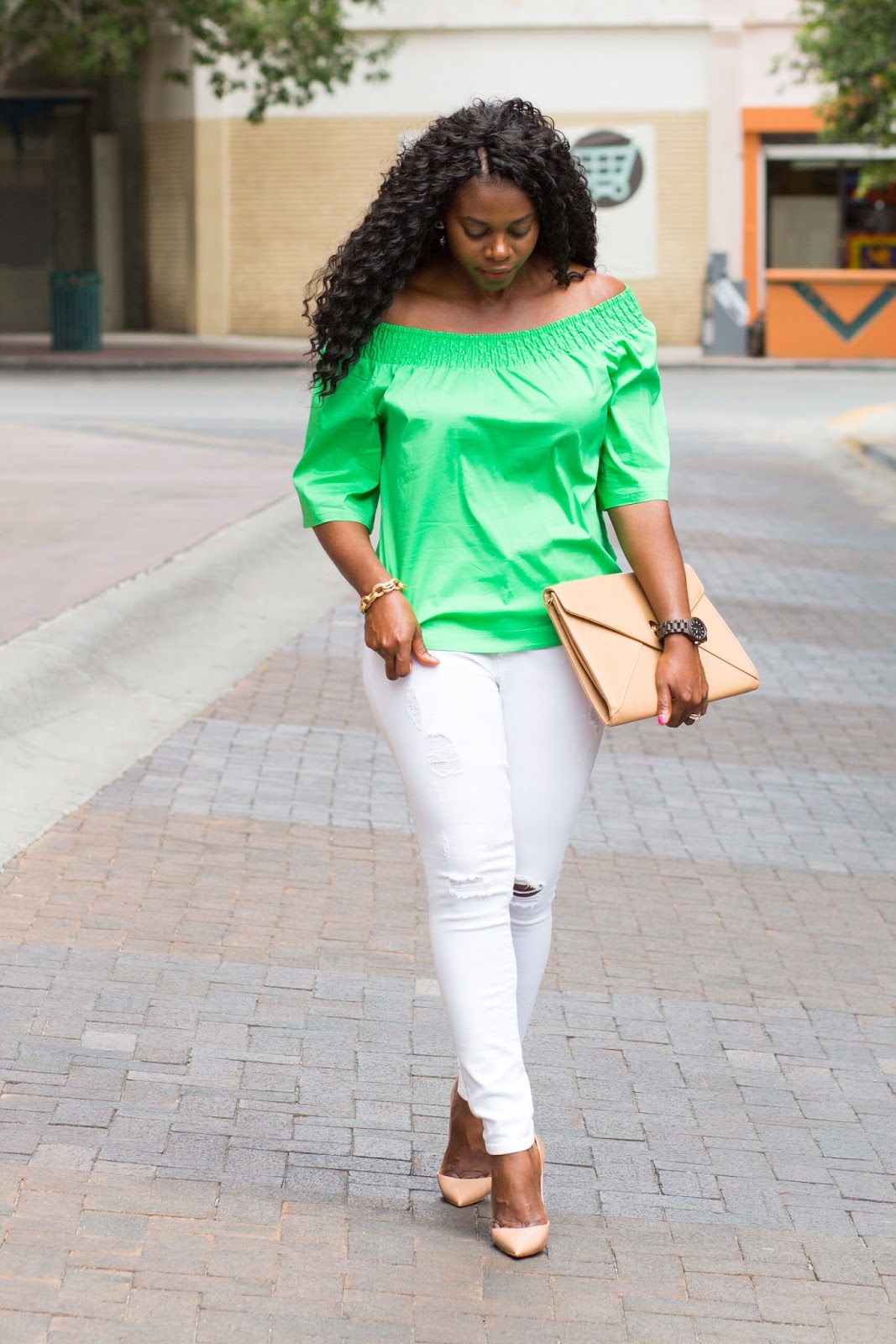 About this look, I wanted to add a pop of color to this white jeans, nude heels, and dark brown jord wood watch combo and did so with a summer trend, this green off the shoulder top. I was gifted this watch and have to say I love that it’s lightweight yet durable. I picked this color because I needed a brown colored watch in my collection but there are so many other pretty color options. If in need of a new watch or a gift idea, consider a jord time piece.