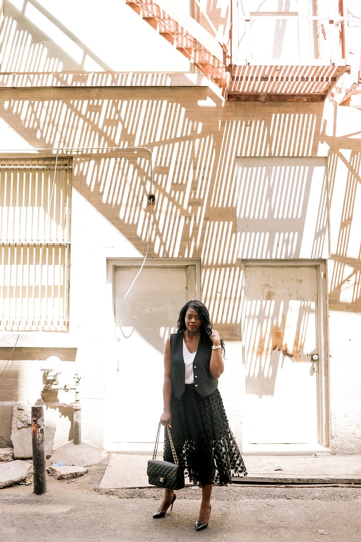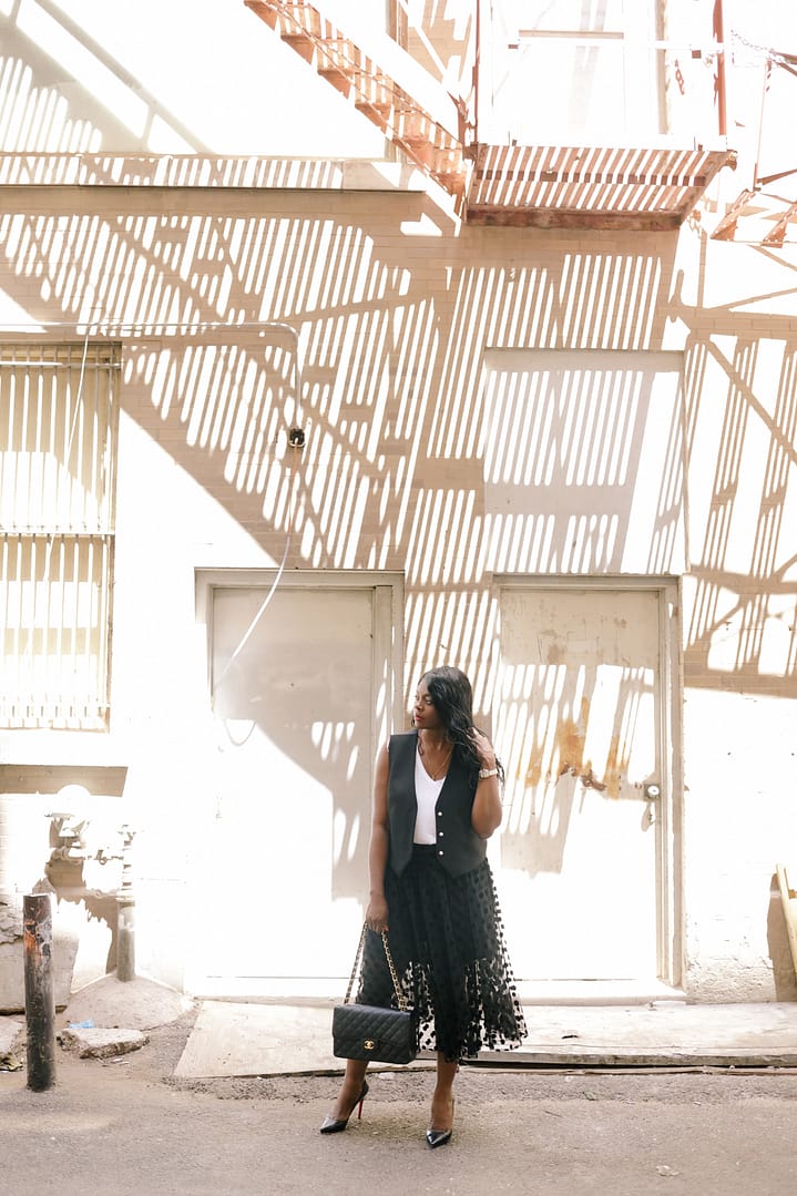 NY & Co, Heels Louboutin, Bag- Chanel, Tank top- H&M, Vest – Zara.