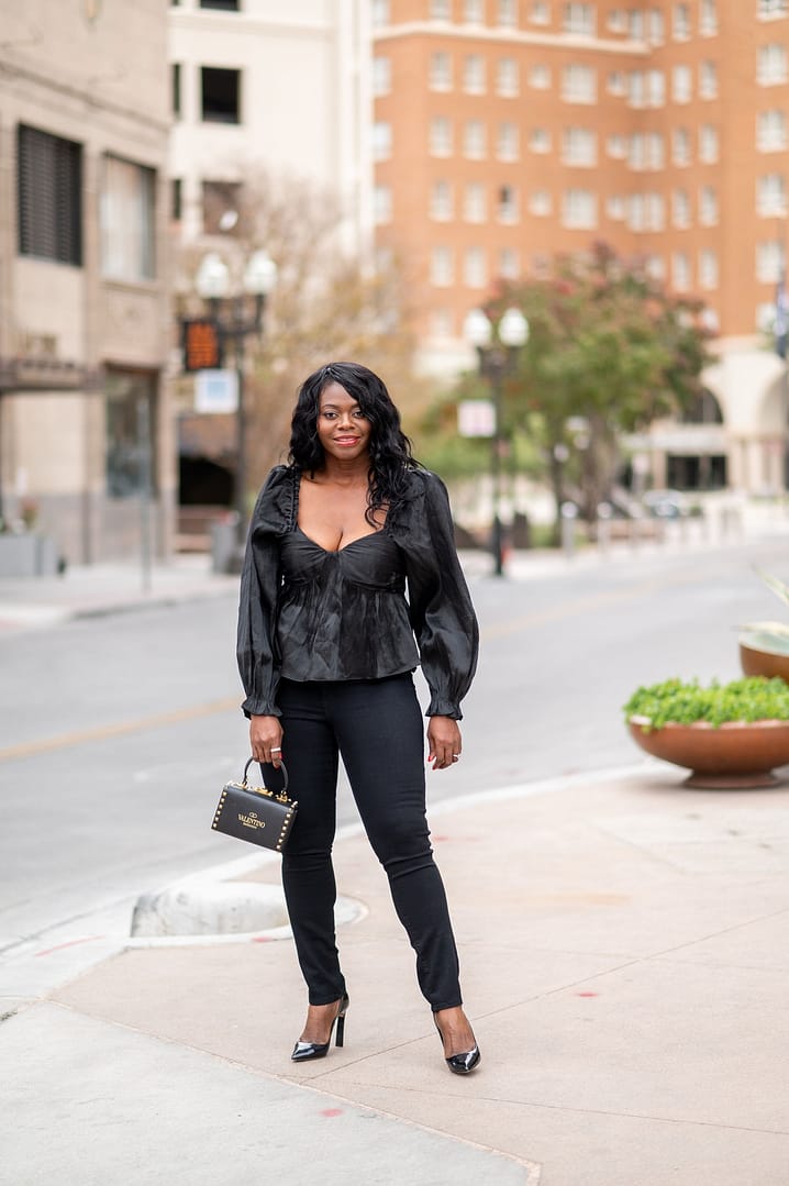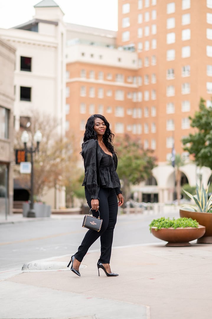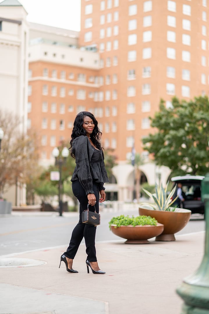 Hello and hope you are having a great day! This outfit is a simple example of a date night look whether with friends or a special someone and if you are not wanting to wear a dress or skirt. Date nights don’t always have to be about dresses, a great pair of jeans and a pretty blouse like this works too. By the way, a high rise pair of trousers and peplum top are both belly flattering closet pieces. Also, when in doubt, wear a monochrome all same color look. Hope you like this!