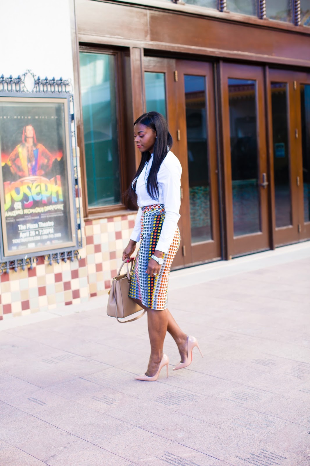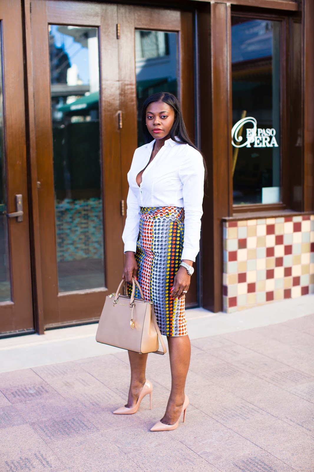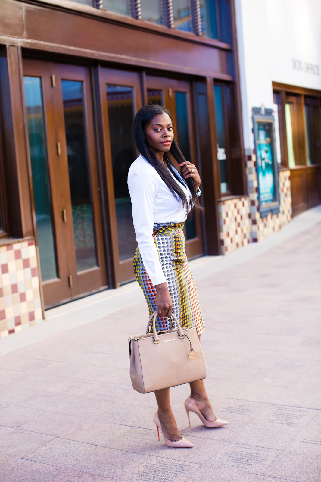 Shirt- H&M (Here), Heels- Christian Louboutin (Here), Skirt- Custom (Ankara fabric sewn, Similar), Bag- Miachael Kors (Here).