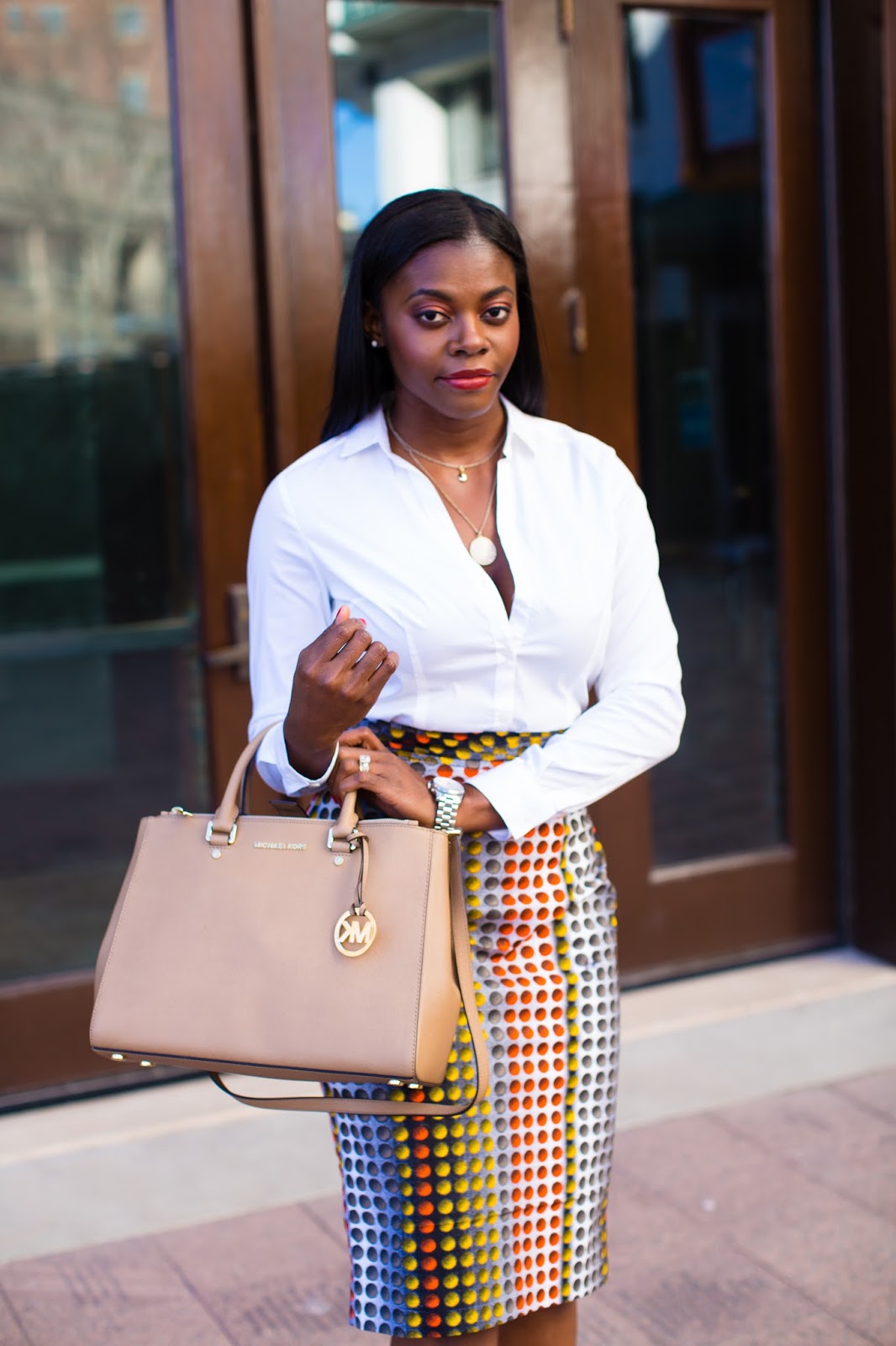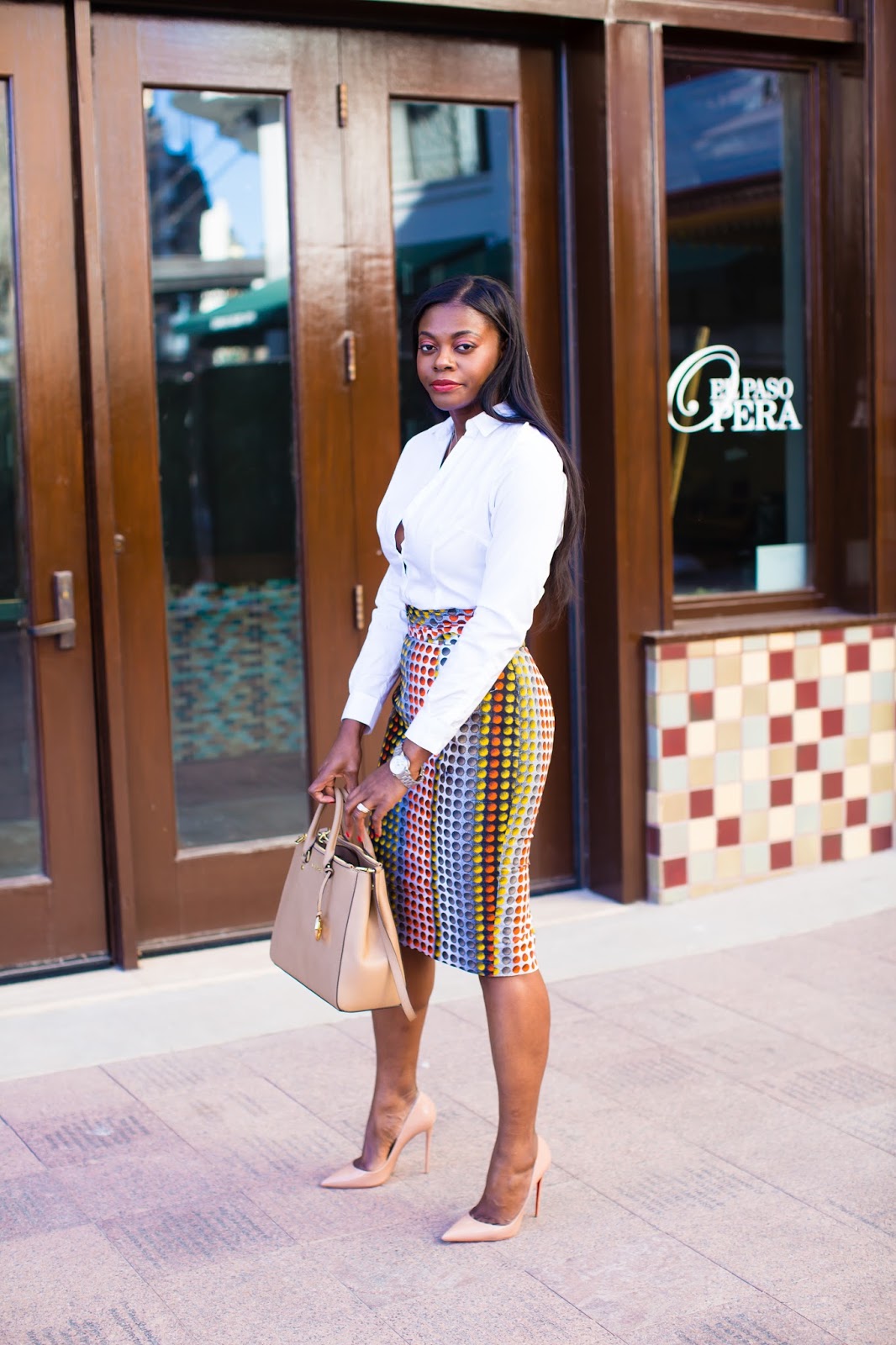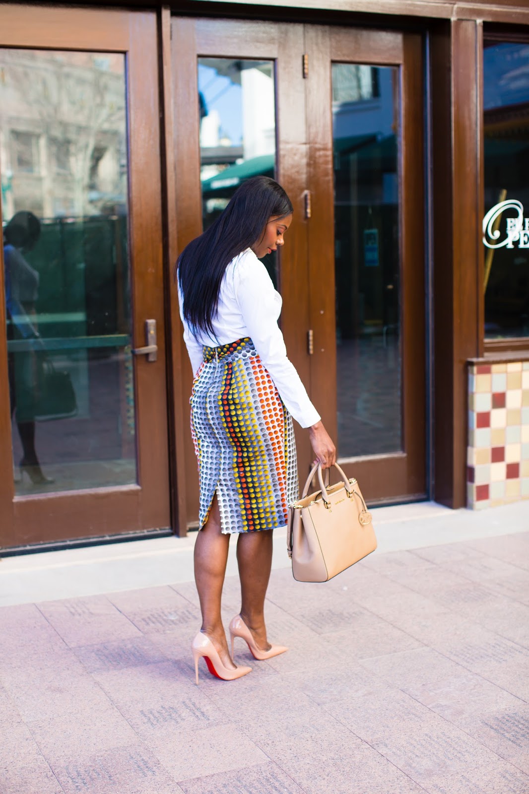 I wanted the focus to stay on the high waist ankara skirt (african inspired fabric skirt) and simply added neutral colors with the bag, shirt and shoes to complete the look. Thanks for stopping by!