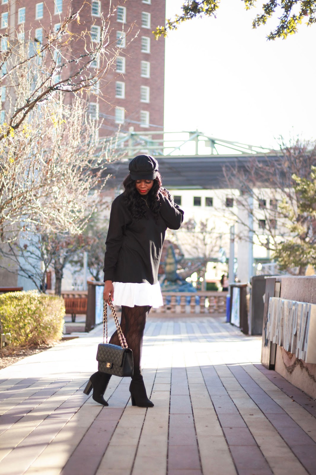 Tights- Gucci (Here), Dress – Misguided (Here), Hat- Nordstrom (Here), Bag- Chanel (Similar, lower priced option here Similar), Booties- Justfab (Similar).