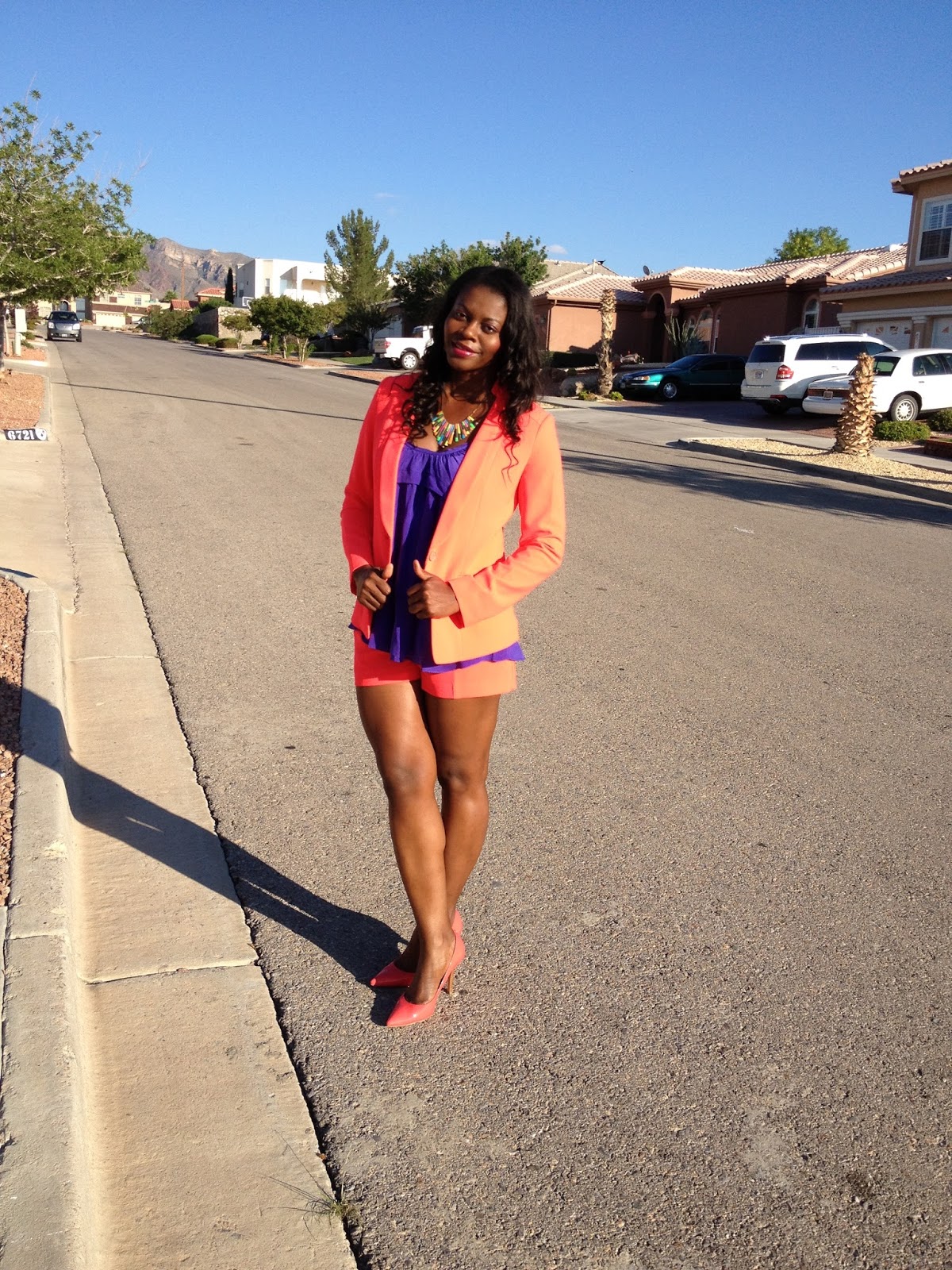I love suits, whether in the form of a skirt, pants, or as in this case shorts. I think suits on women can look empowering yet sexy in a subtle way. I had purchased the shorts in the past and recently got the matching jacket while on sale thinking that it’s a jacket that can be worn in different ways. Here, I paired it with a purple sleeveless blouse I’d received in the past as a gift, paired with coral shoes, and bright jewelry to keep the whole look colorful.