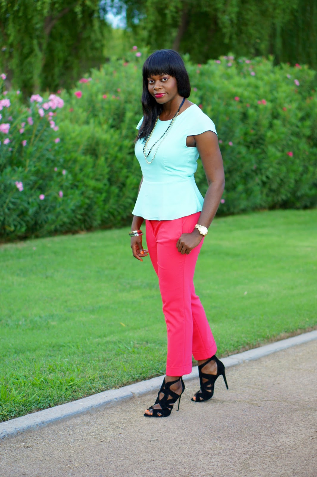 But since the pants are pink, I enhanced the color with the mint peplum top for more color but added the strappy heels to make the look less conservative to go out. So guess what? As if I need a reason to go shopping, this gives me one to shop for a job interview attire and I wonder what else I’ll find ha!