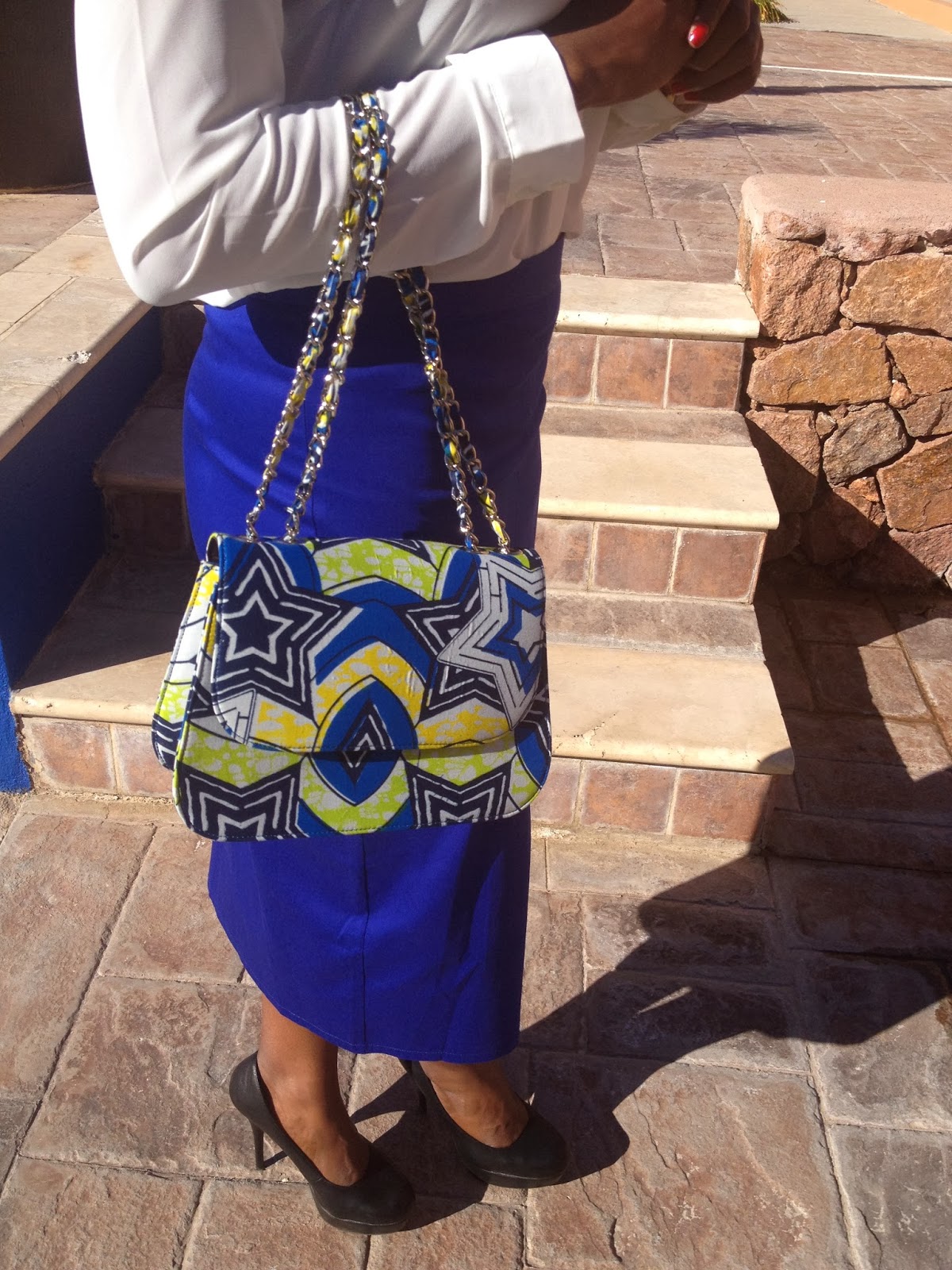 Anyway, I was happy to receive this bag from Debisi. It can be called an Ankara bag or African inspired bag because of the African fabrics, prints used which are usually bold/bright. Because it’s a printed blue bag, I paired it with this slit blue skirt, but kept the rest of the look more neutral keeping the focus on the bag. I think adding a printed accessory to an outfit is one way to make the look pop.