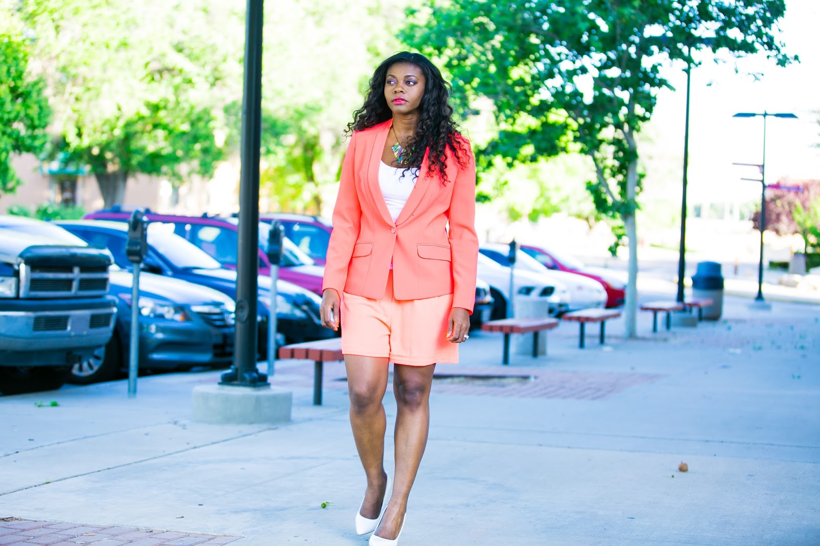 About this outfit, I wanted a ‘suit’ look but one that’s more fun and not so serious. The jackets matching shorts were a bit shorter than I wanted this time so I paired these shorts of a similar coral color hue with the jacket, keeping the look simple with a white tank top, jewelry, and heels. I think it’s ok to wear a suit with not exact colors as long as the colors are of a similar hue. Thanks!