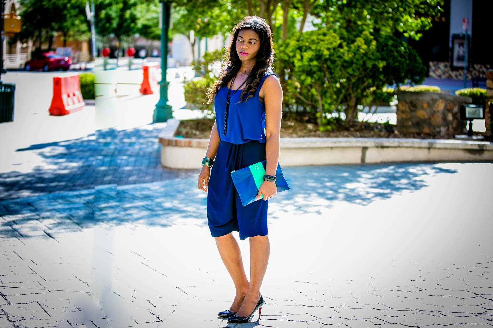 When it comes to trends, I’ll try most as long as it flatters my body and is not inappropriate. Culottes can be described as pants/shorts that look like a skirt. These are a recent trend I liked because it’s comfortable, modest, and a style I remember wearing years ago so it was easy to revisit. I thought since these already had an interesting look with the sarong style, I kept the rest of the look simple with a matching simple navy top, bag, black heels and jewelry.