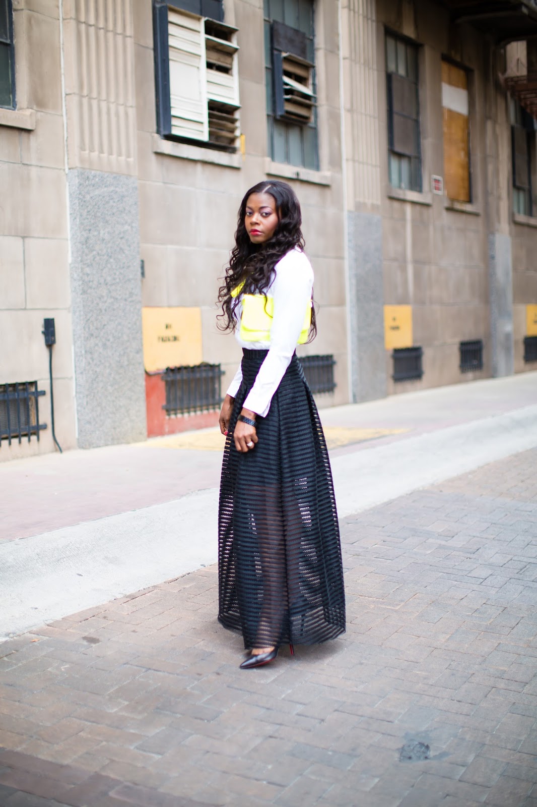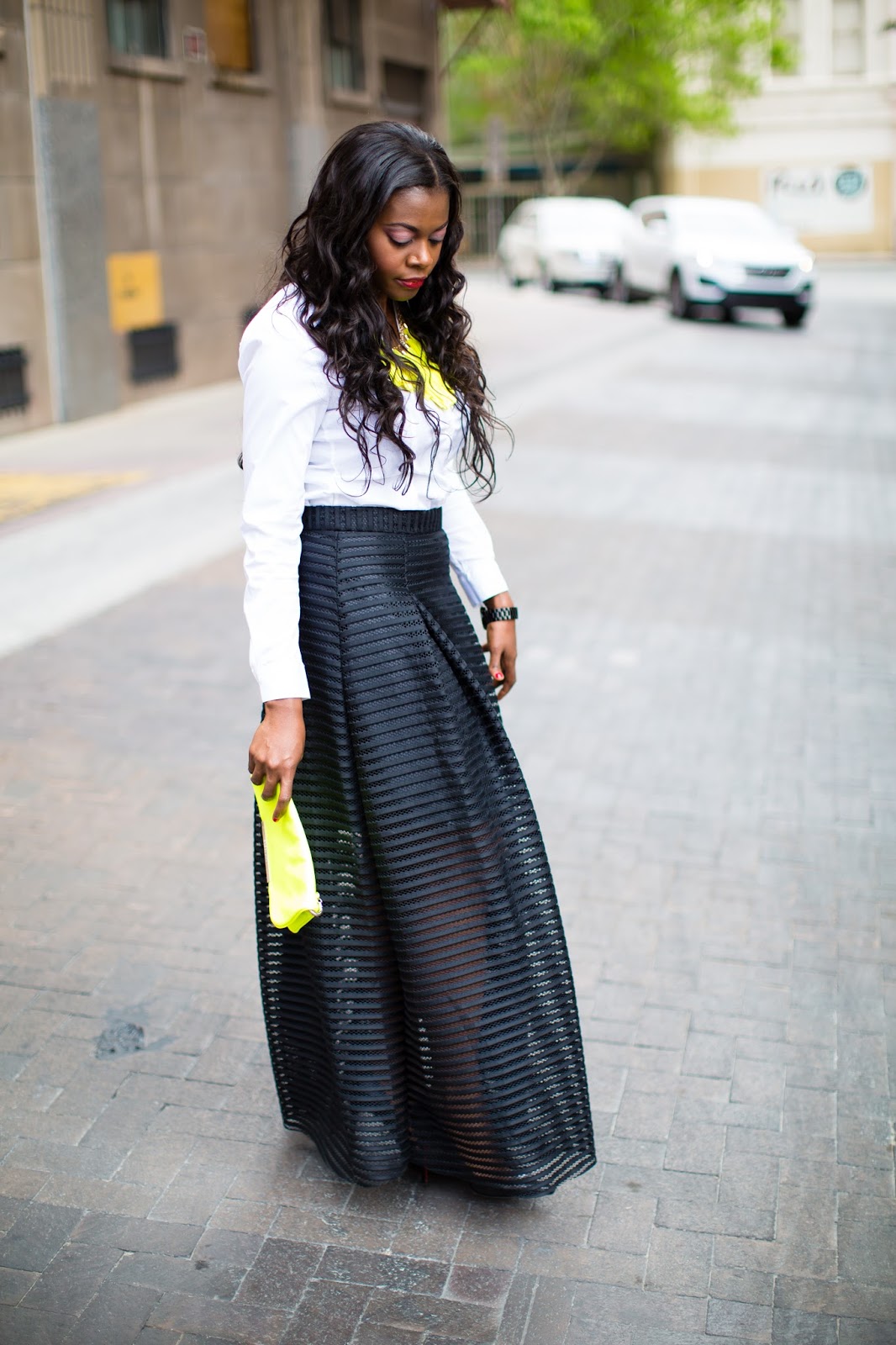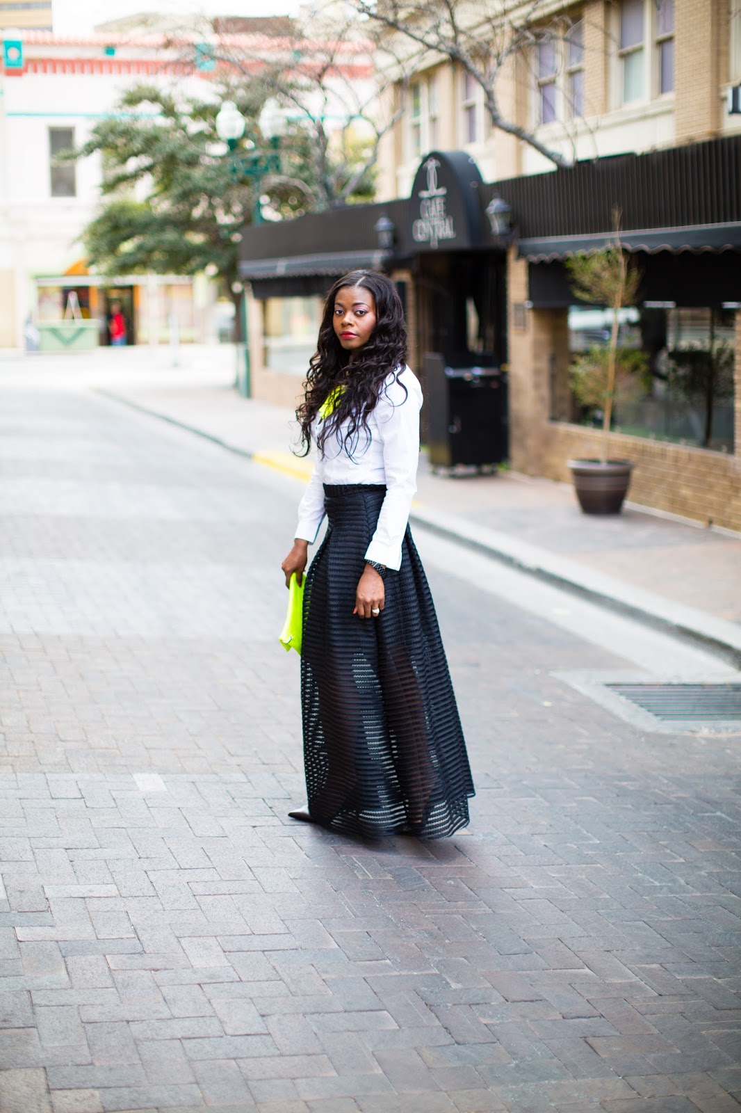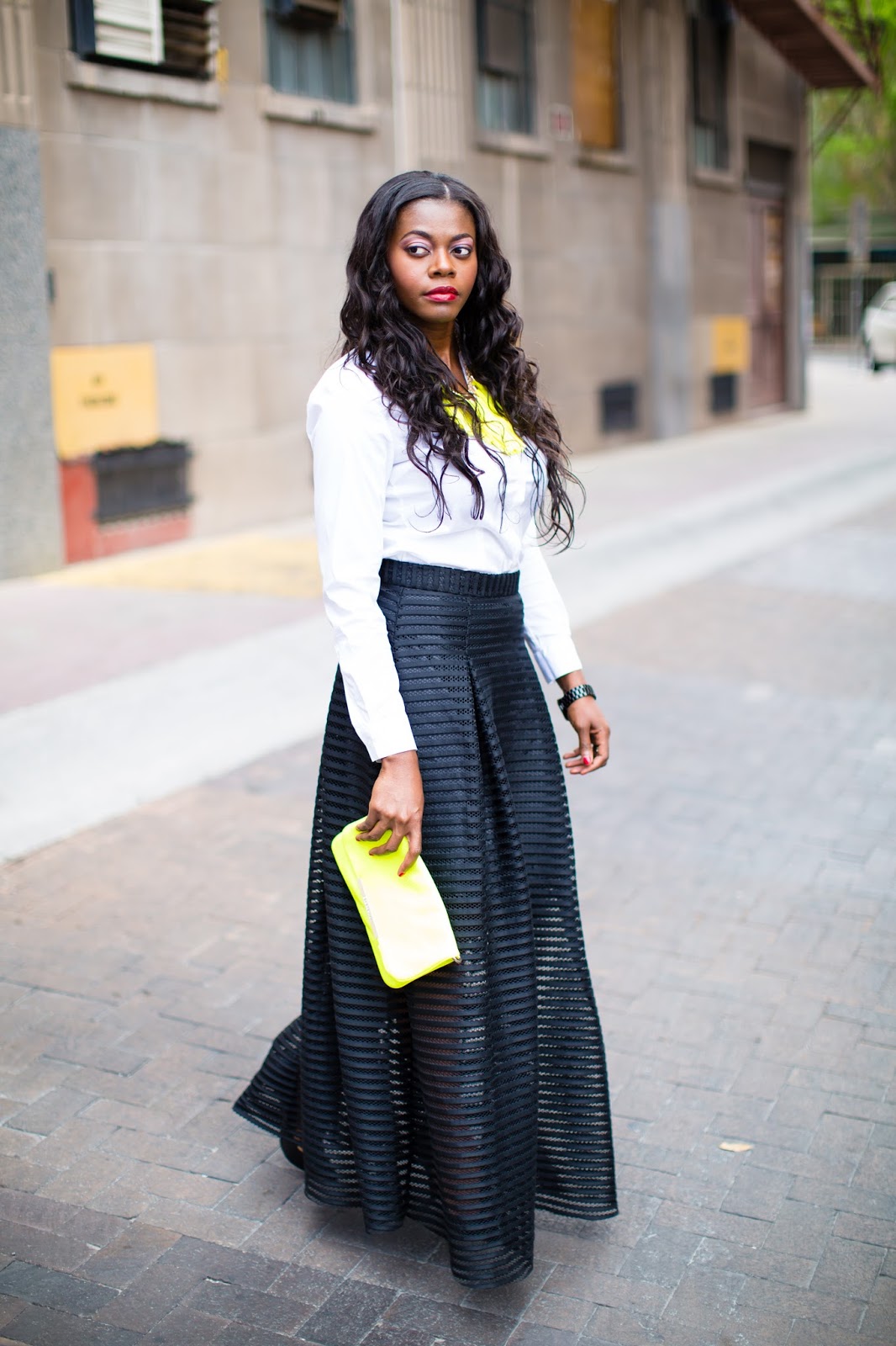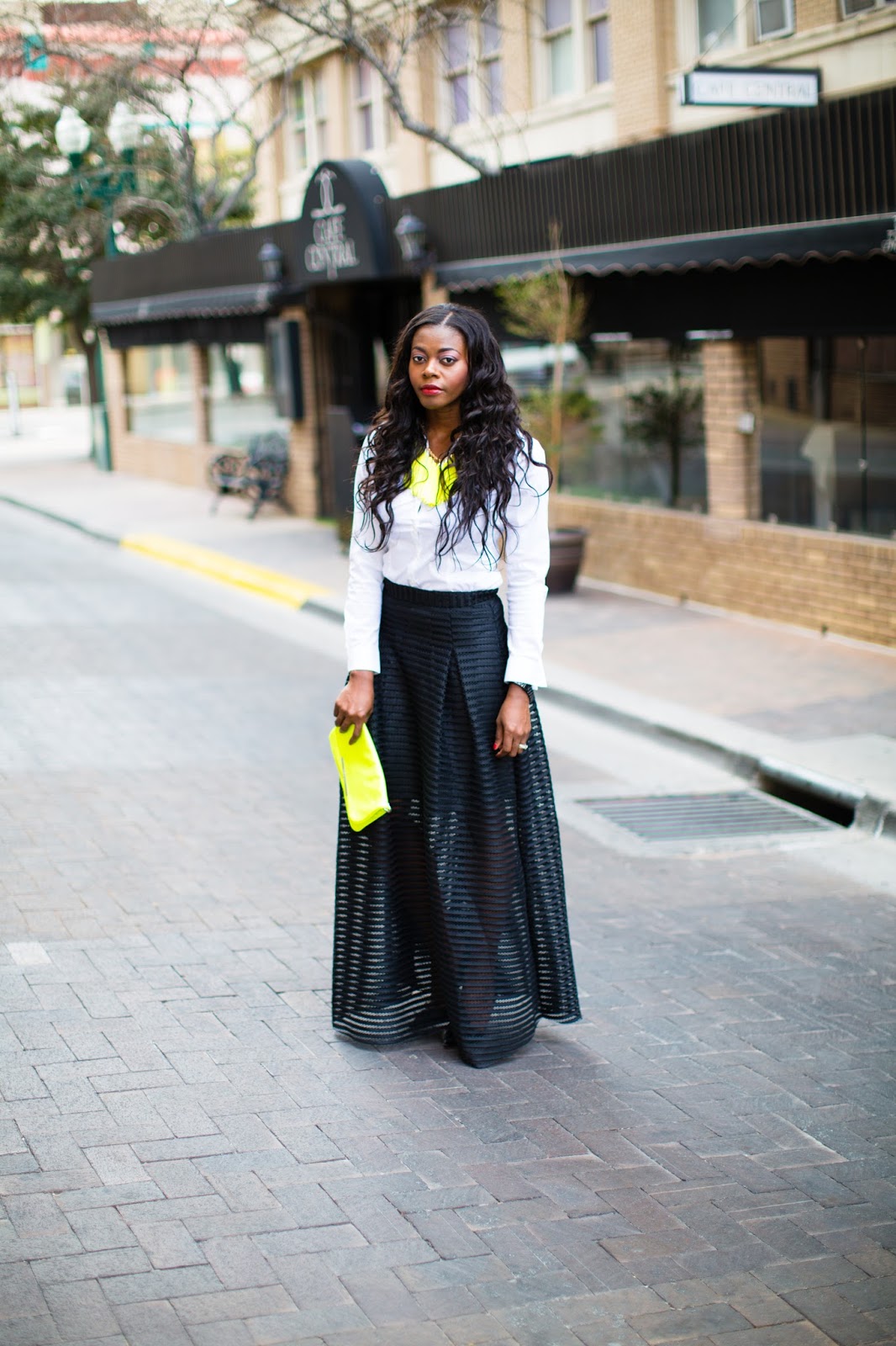 Anyway with this outfit, I paired this sheer maxi skirt which I love because although long and covered up, the sheerness is a fun twist. I chose to add a pop of color with the necklace and clutch and added some of my favorite closet items, a white shirt and classic black heels. Thanks for stopping by!