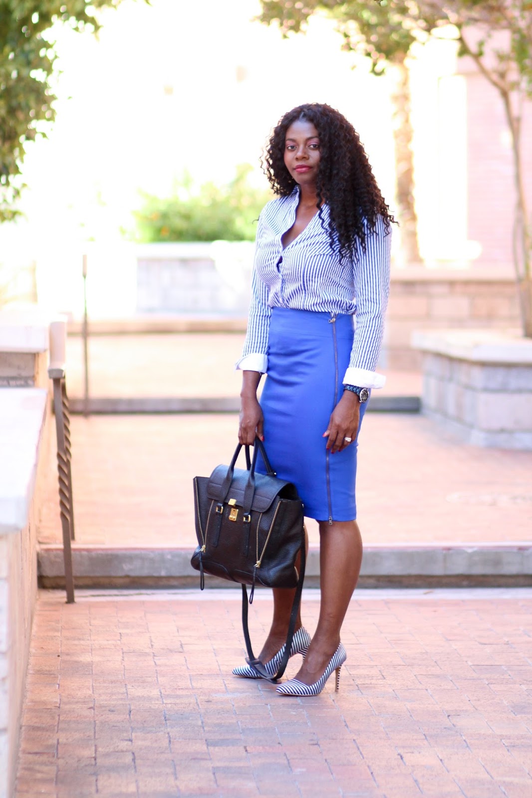 Speaking of hard work, I chose to share a work inspired look today with the pencil skirt and button down shirt which I think are always appropriate for work as long as they’re not too tight. I added the striped heels to match the striped shirt and a big bag that’s great for work. Although this is a work look, the pieces can also be dressed differently for an outing. As always, thanks for visiting!