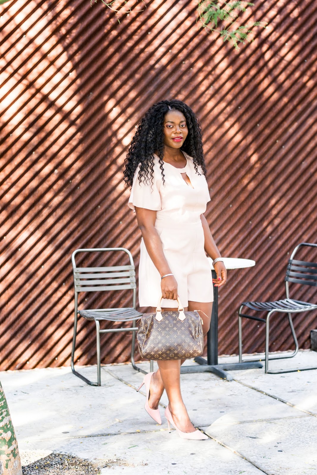 About this look, the older I get and just becoming a mother makes me pick shorts and rompers that tend to be a bit longer so when I saw this I loved the fit and length. I thought to pair it with blush pink heels too and because I didn’t have a blush bag to keep the look monochromatic, I paired it with a print I feel is almost like a neutral, the LV print. Hope you like, thanks for viewing!