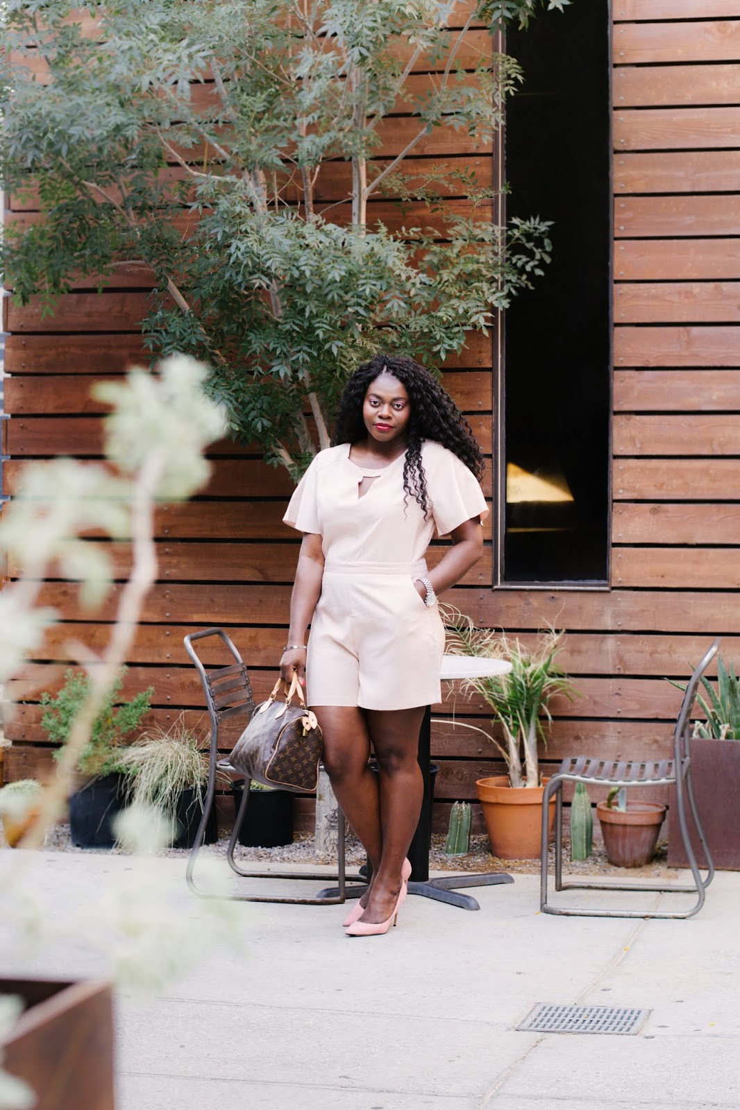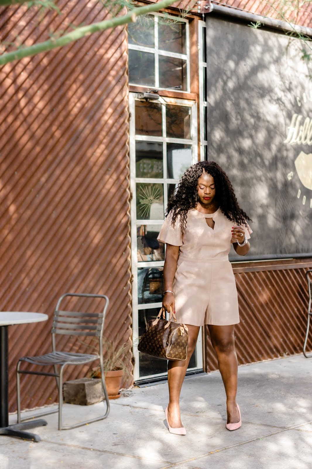 About this look, the older I get and just becoming a mother makes me pick shorts and rompers that tend to be a bit longer so when I saw this I loved the fit and length. I thought to pair it with blush pink heels too and because I didn’t have a blush bag to keep the look monochromatic, I paired it with a print I feel is almost like a neutral, the LV print. Hope you like, thanks for viewing!