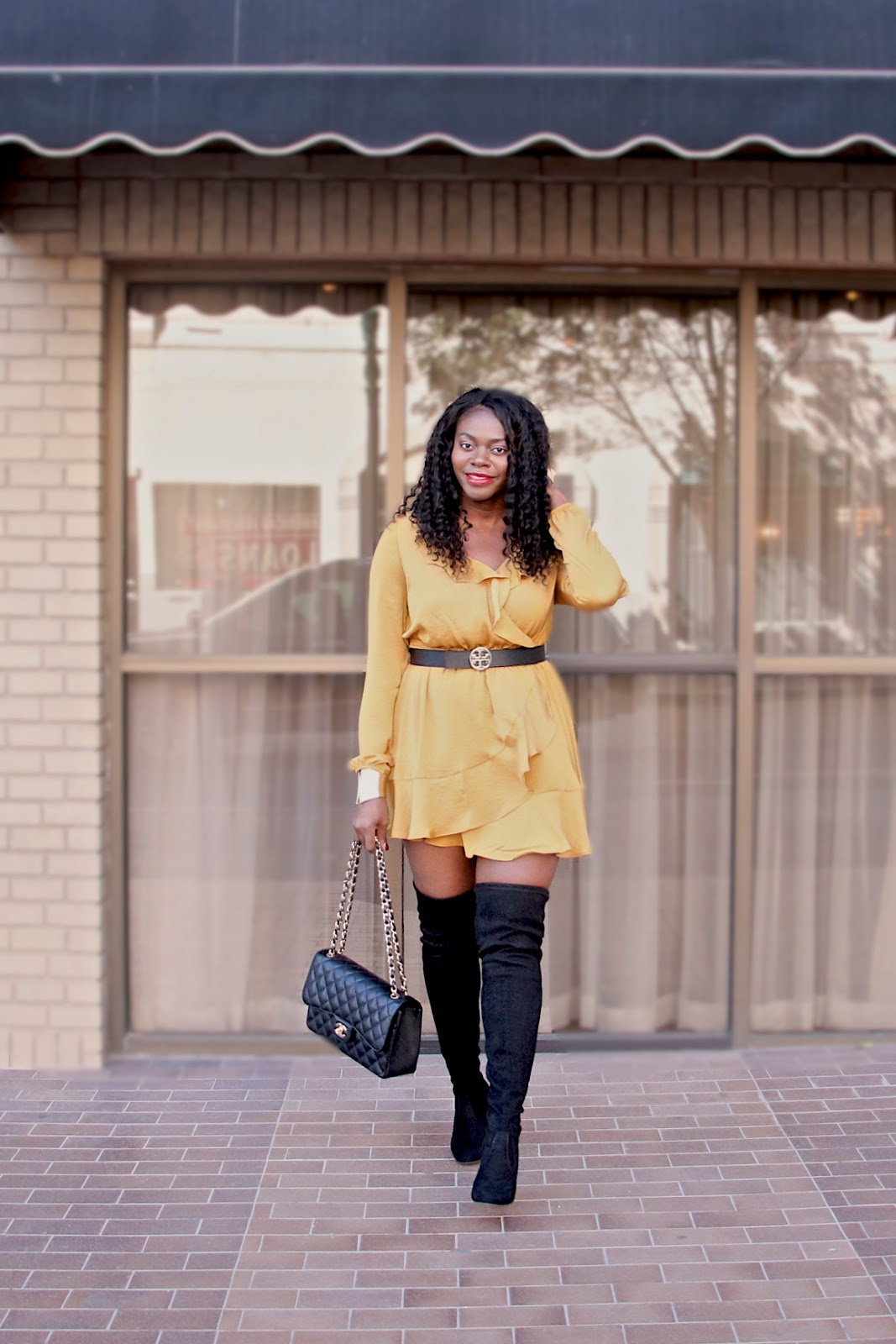 This ruffles are a fun addition and the color just made me like the dress more. I think this mustard yellow color is great year round. I chose to add a black belt to the elastic waist area, a black bag, and added over the knee boots since it’s a short dress. Hope you like the look and thanks for stopping by!