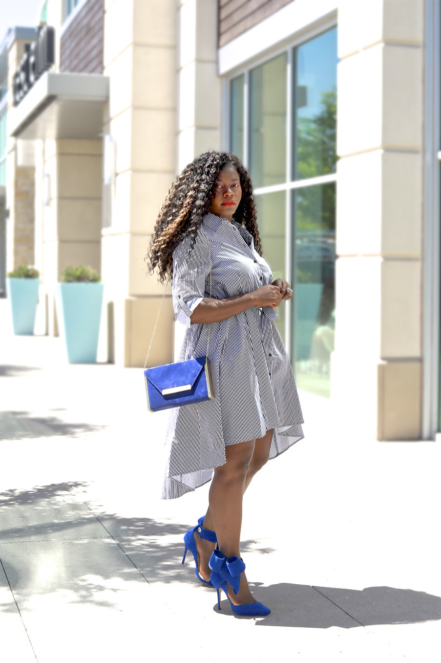 With this look, I wanted to style this comfortable high low fit and flare shirt dress so I paired it with a few blue pieces being the blue bow heels and bag to match.  This fit and flare dress is so easy to wear comfortable and can be dressed up or down.  Hope you like, thanks for viewing!