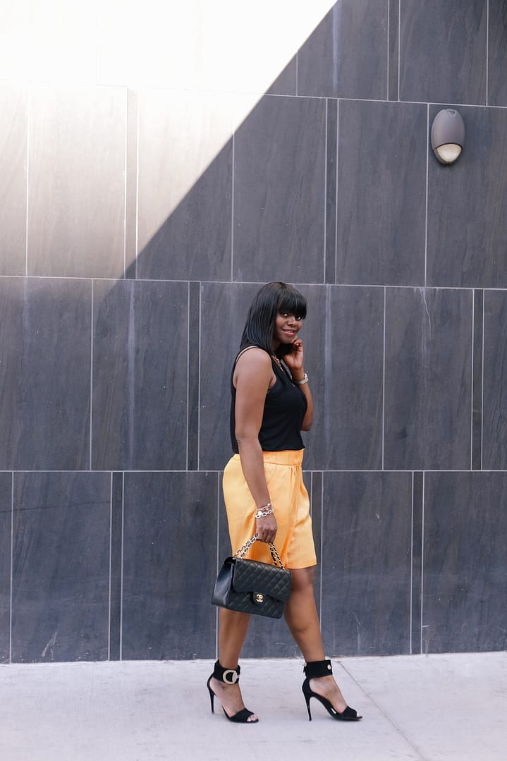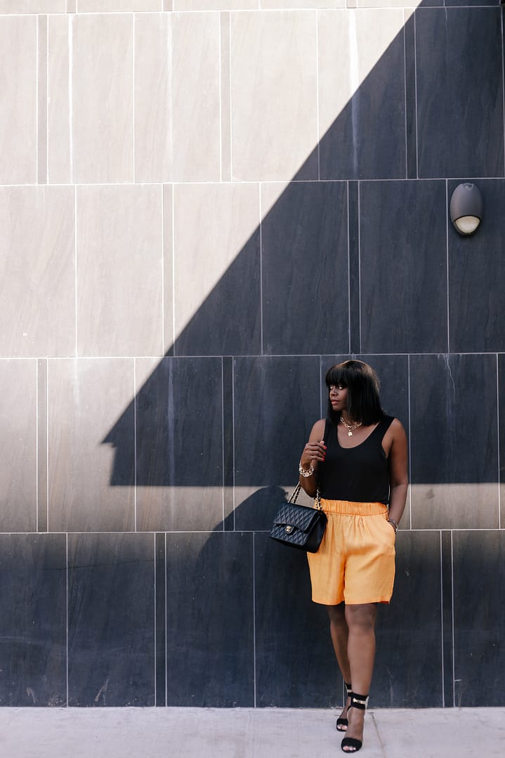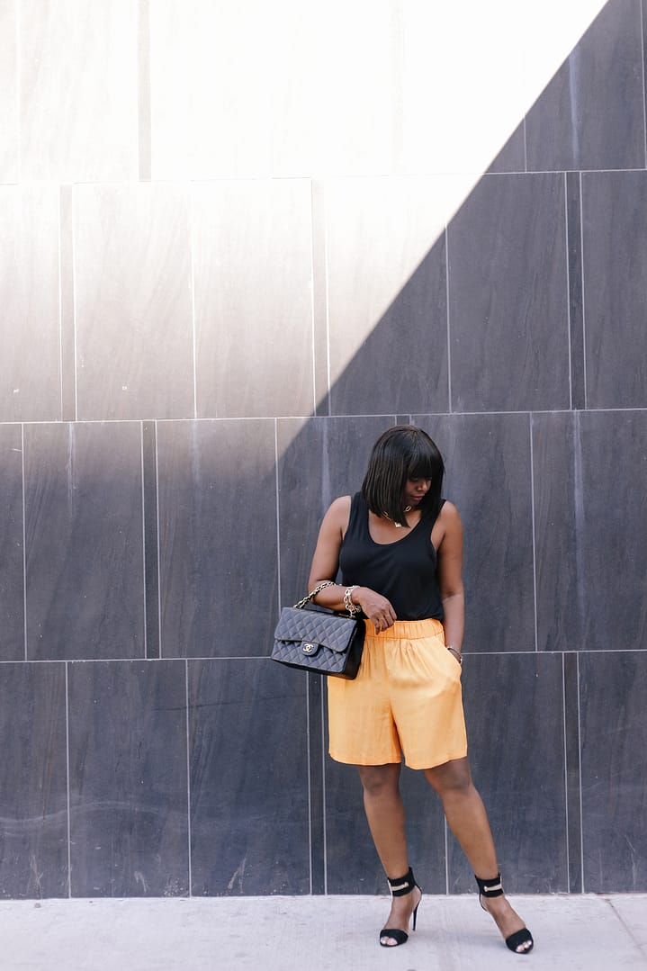 Anyway this look is all about the orange which I believe is one of the season’s hottest colors. I think different shades of orange can flatter different skin tones and the brighter the better for darker skin like mine. I simply added black pieces keeping the look simple and focused on the orange shorts. Hope you like it and thanks for stopping by!