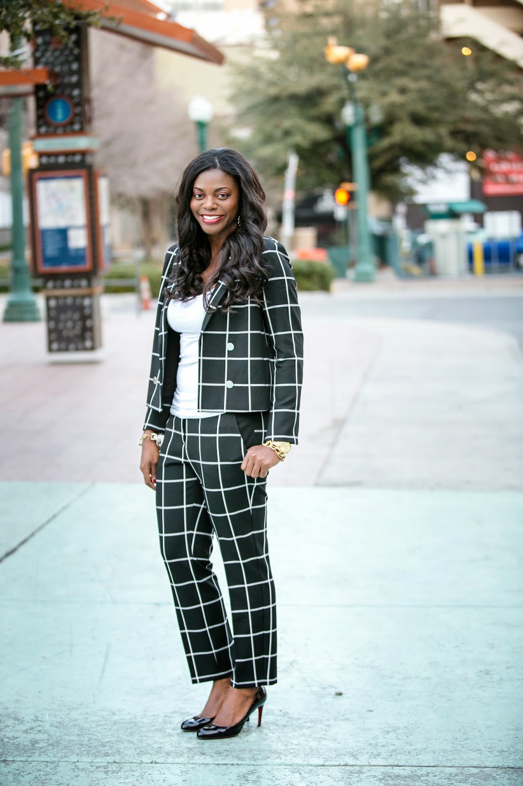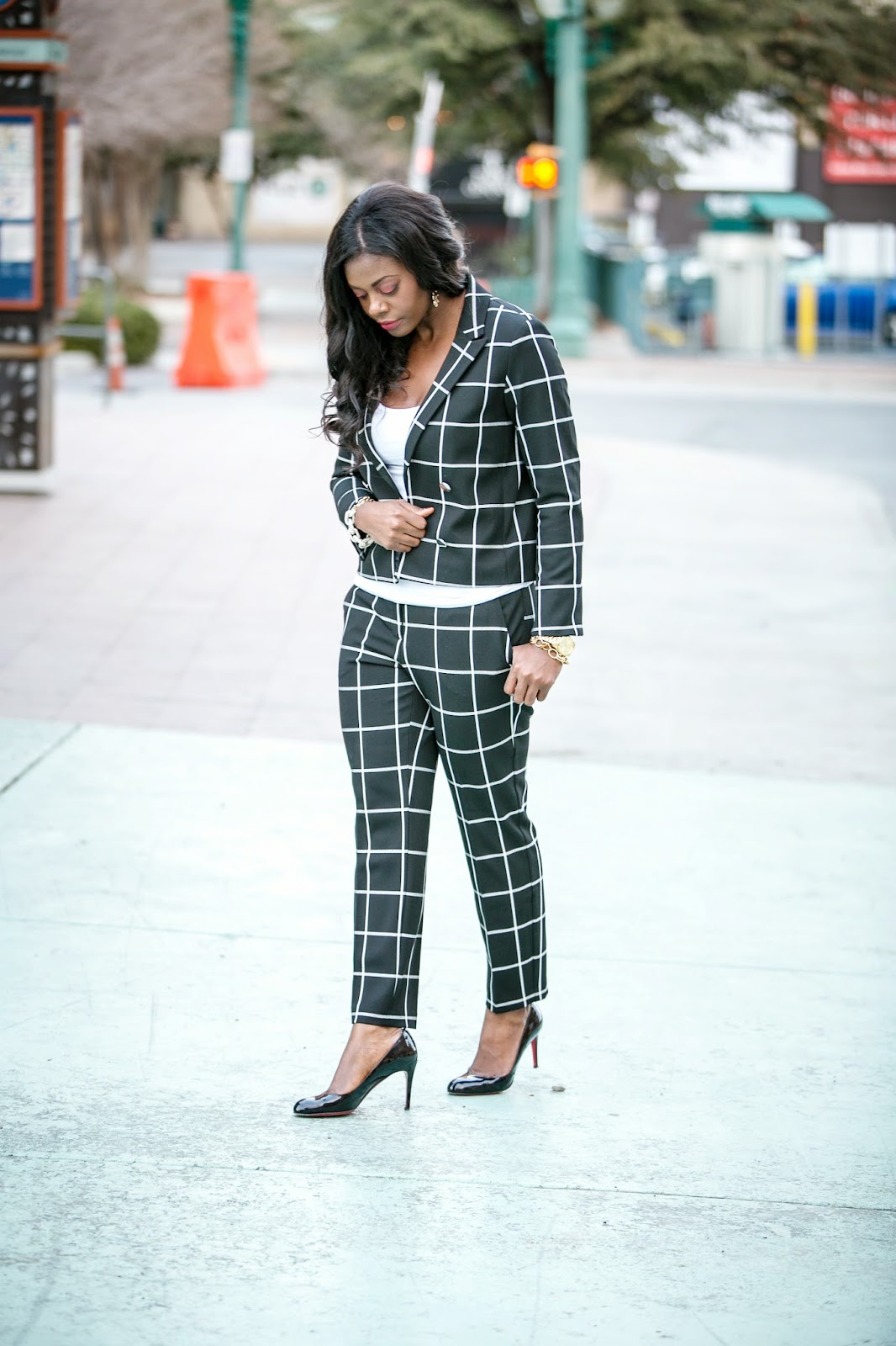Suit{Trousers & Jacket}- [sale find in store] Express (Similar, & Similar, Similar), Top- Forever 21 (Similar), Heels-Christian Louboutin (Similar).