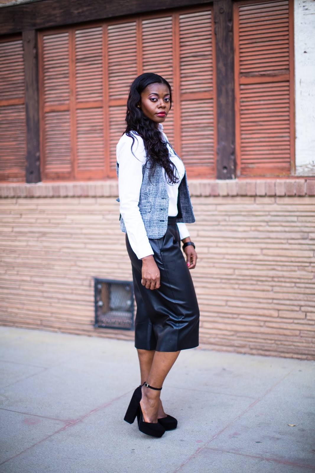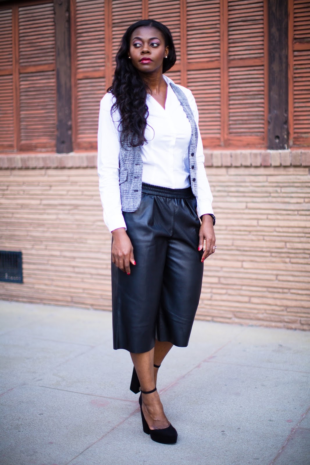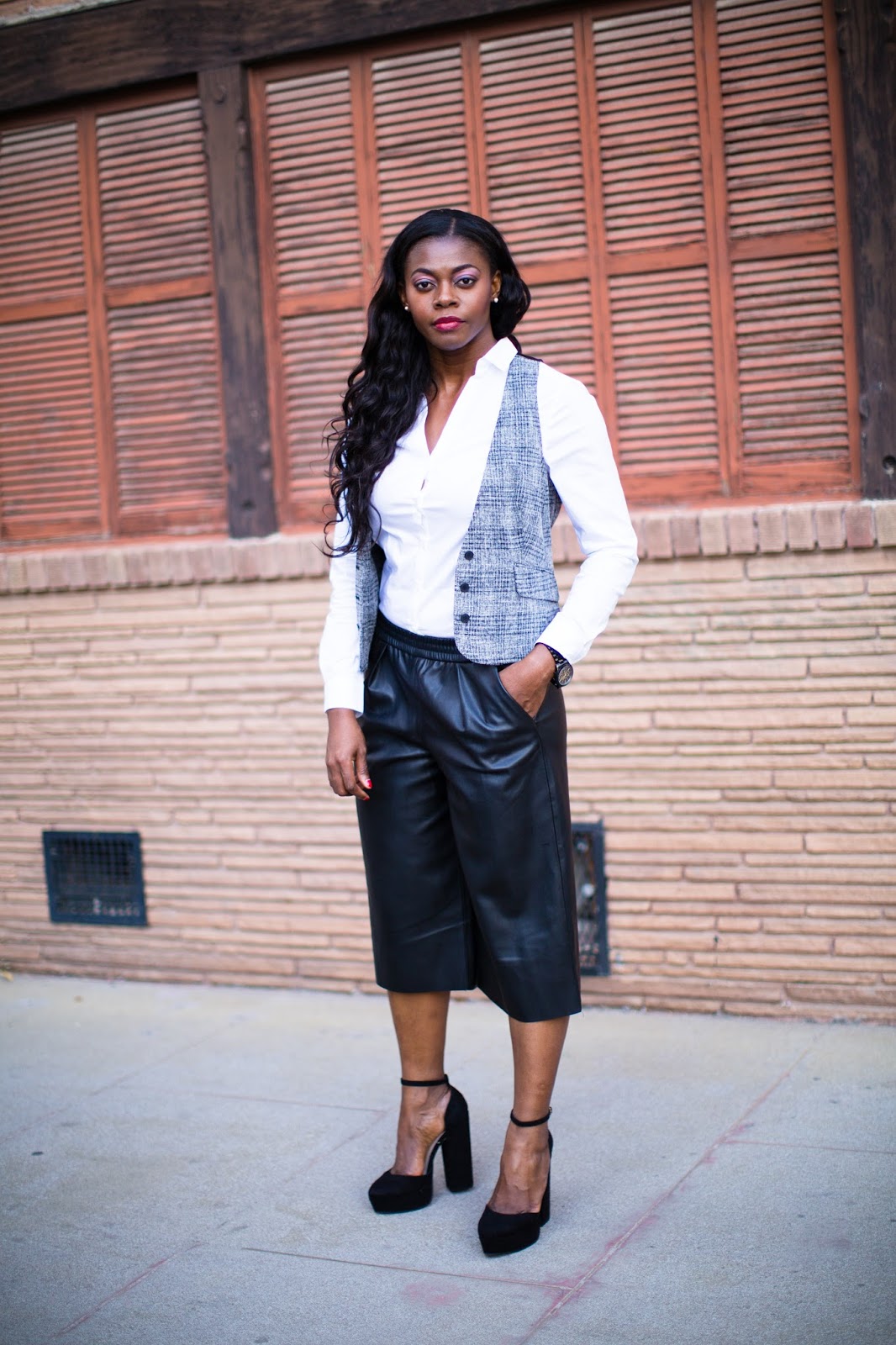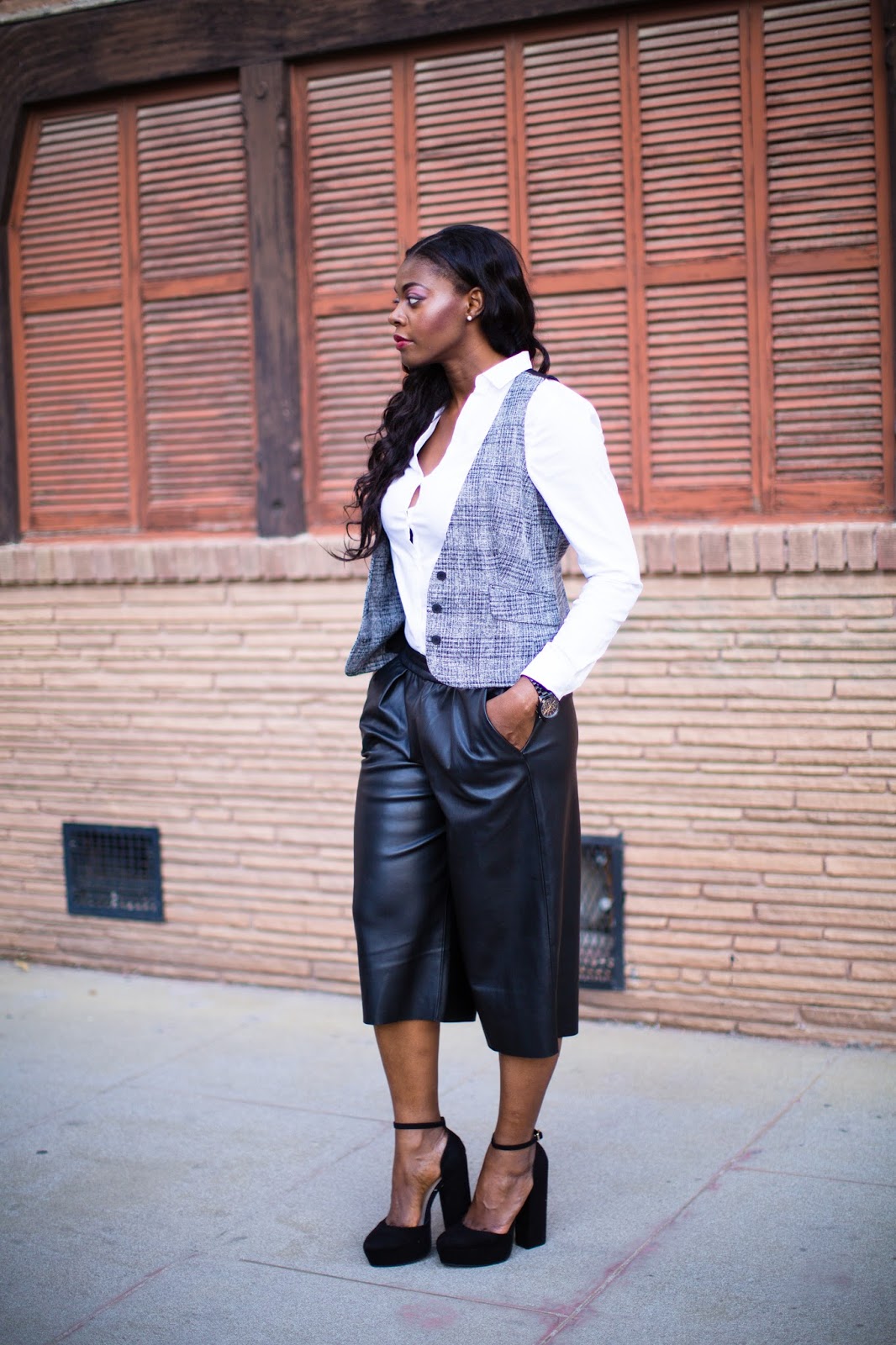 About this look, I shopped my closet and decided to style this vest, a piece I’d had for years but never worn. I think vests are classic and come in so many styles. Being a classic item, I chose to pair it with a classic white shirt but for a minor twist, added more trendy pieces with the faux leather culottes and chunky heels. Hope you like and thanks for stopping by!