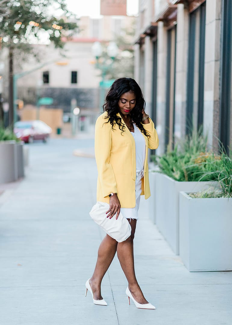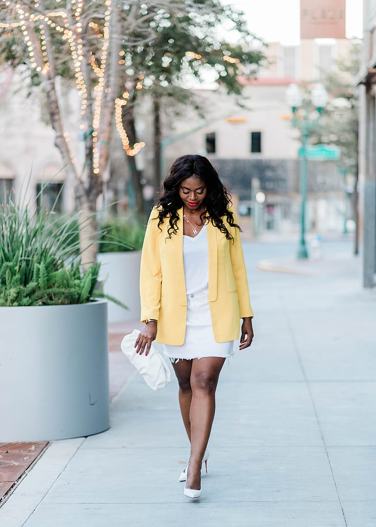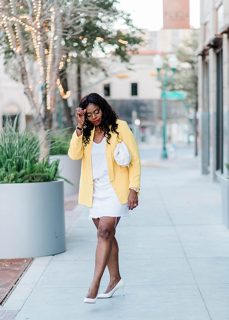 I also wanted to share this look with white denim skirt. Yellow is a popular color this season and I wanted to style this yellow blazer so I paired it with the white denim skirt and kept the rest of the look white and simple. I believe blazers can be worn year round and this is one way to style it in the warmer season. Hope you like and thanks for stopping by